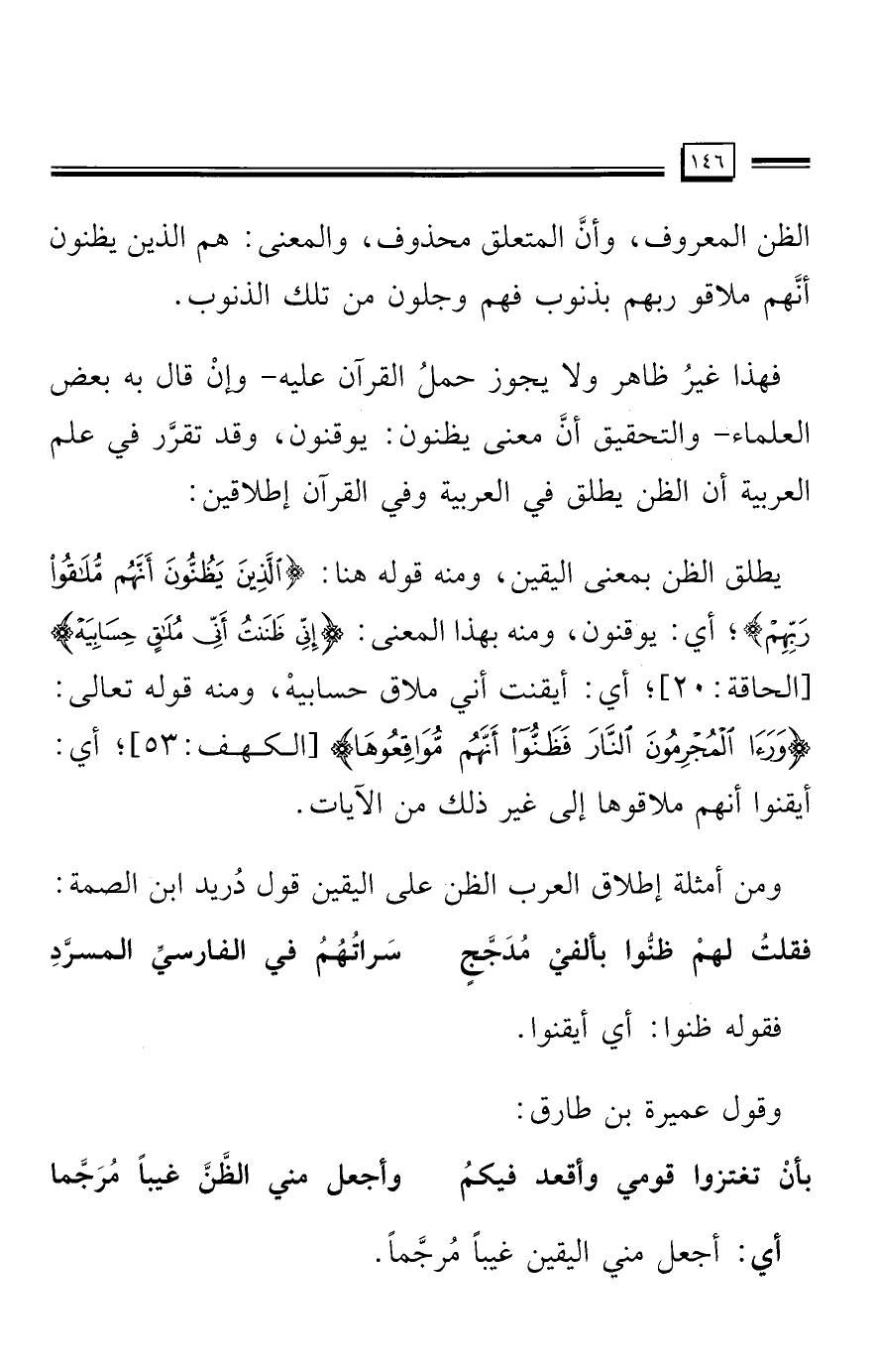 فهذا غيرُ ظاهر ولا يجوز حملُ القرآن عليه -وإنْ قال به بعض العلماء- والتحقيق أنَّ معنى يظنون: يوقنون، وقد تقرَّر في علم العربية أن الظن يطلق في العربية وفي القرآن إطلاقين: