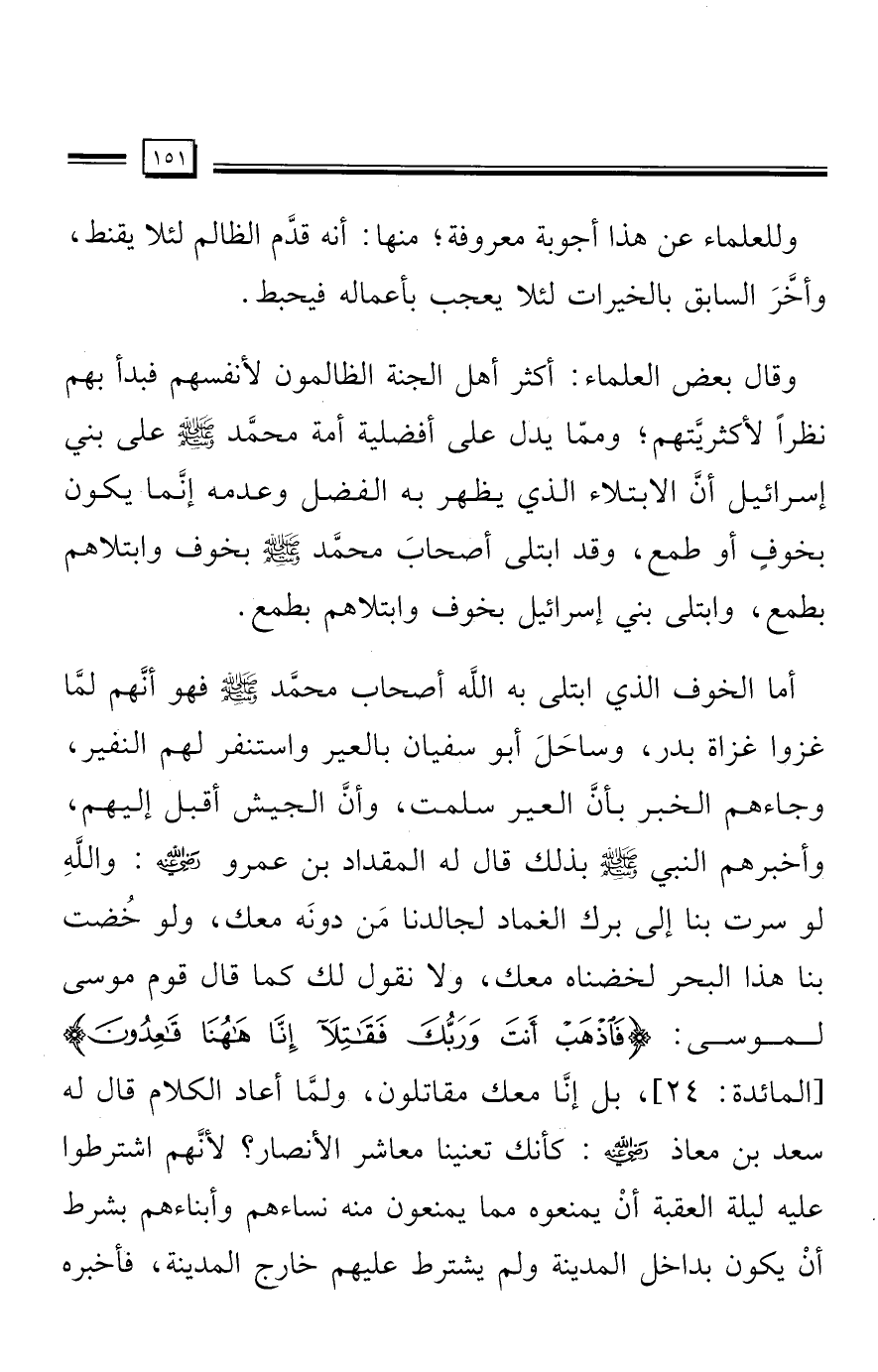 وقال بعض العلماء: أكثر أهل الجنة الظالمون لأنفسهم فبدأ بهم نظرًا لأكثريَّتهم؛ ومما يدل على أفضلية أمة مُحَمَّد - صلى الله عليه وسلم - على بني إسرائيل أنَّ الابتلاء الذي يظهر به الفضل وعدمه إنَّما يكون بخوفٍ أو طمع، وقد ابتلى أصحابَ مُحَمَّد - صلى الله عليه وسلم - بخوف وابتلاهم بطمع، وابتلى بني إسرائيل بخوف وابتلاهم بطمع.