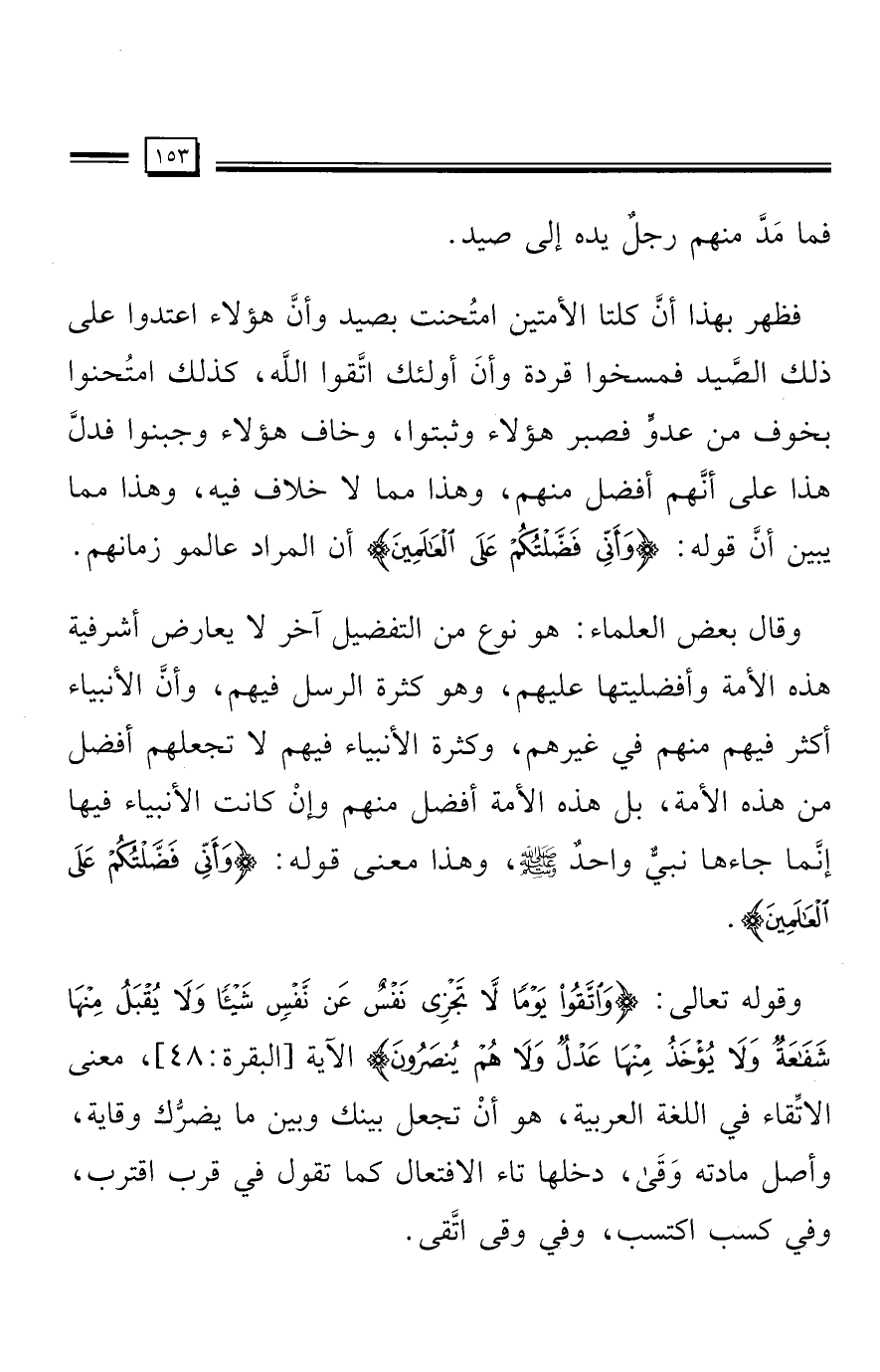 فظهر بهذا أن كلتا الأمتين امتُحنت بصيد وأنَّ هؤلاء اعتدوا على ذلك الصَّيد فمسخوا قردة وأنَّ أولئك اتَّقوا الله، كذلك امتُحنوا بخوف من عدوٍّ فصبر هؤلاء وثبتوا، وخاف هؤلاء وجبنوا فدلَّ هذا على أنَّهم أفضل منهم، وهذا مما لا خلاف فيه، وهذا مما يبين أن قوله: {وَأَنِّي فَضَّلْتُكُمْ عَلَى الْعَالَمِينَ} أن المراد عالمو زمانهم.