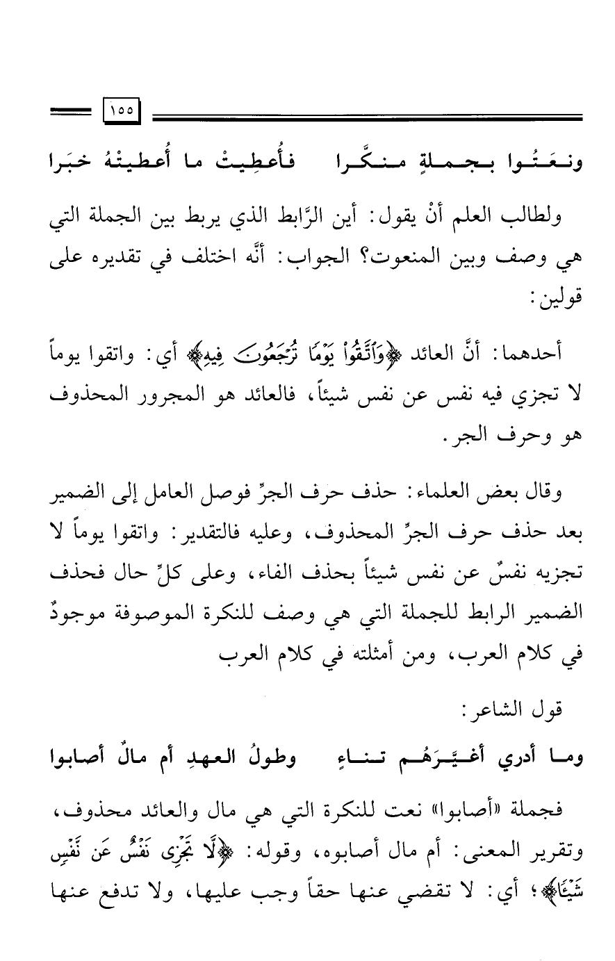 وقال بعض العلماء: حذف حرف الجرّ فوصل العامل إلى الضمير بعد حذف حرف الجرّ المحذوف، وعليه فالتقدير: واتقوا يومًا لا تجزيه نفسٌ عن نفس شيئًا بحذف الفاء، وعلى كلِّ حال فحذف الضمير الرابط للجملة التي هي وصف للنكرة الموصوفة موجودٌ في كلام العرب، ومن أمثلته في كلام العرب