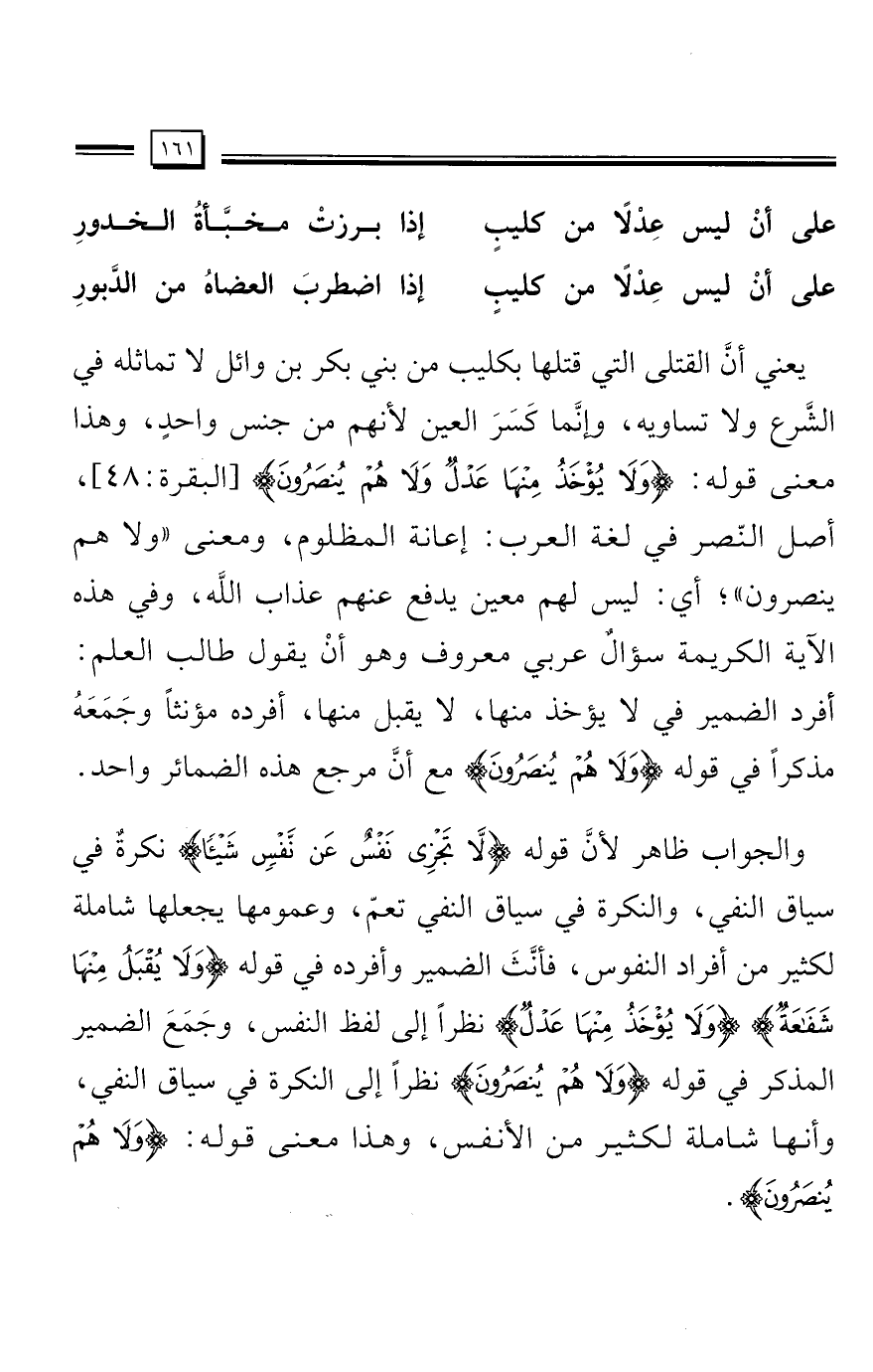 يعني أنَّ القتلى التي قتلها بكليب من بني بكر بن وائل لا تماثله في الشَّرع ولا تساويه، وإنَّما كَسَرَ العين لأنهم من جنس واحد، وهذا معنى قوله: {وَلَا يُؤْخَذُ مِنْهَا عَدْلٌ وَلَا هُمْ يُنْصَرُونَ} [البقرة: 48] , أصل النصر في لغة العرب: إعانة المظلوم، ومعنى "ولا هم ينصرون"؛ أي: ليس لهم معين يدفع عنهم عذاب الله، وفي هذه الآية الكريمة سؤال عربي معروف وهو أنْ يقول طالب العلم: أفرد الضمير في لا يؤخذ منها, لا يقبل منها، أفرده مؤنثًا وجَمَعَهُ مذكرًا في قوله {وَلَا هُمْ يُنْصَرُونَ} مع أن مرجع هذه الضمائر واحد.