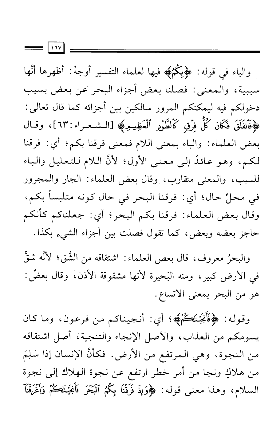 والباء في قوله: {بِكُمُ} فيها لعلماء التفسير أوجهٌ: أظهرها أنَّها سببية، والمعنى: فصلنا بعض أجزاء البحر عن بعض بسبب دخولكم فيه ليمكنكم المرور سالكين بين أجزائه كما قال تعالى: {فَانْفَلَقَ فَكَانَ كُلُّ فِرْقٍ كَالطَّوْدِ الْعَظِيمِ} [الشعراء: 63] , وقال بعض العلماء: والباء بمعنى اللام فمعنى فرقنا بكم؛ أي: فرقنا لكم، وهو عائدٌ إلى معنى الأول؛ لأن اللام للتعليل والباء للسبب، والمعنى متقارب، وقال بعض العلماء: الجار والمجرور في محلِّ حال؛ أي: فرقنا البحر في حال كونه متلبسًا بكم، وقال بعض العلماء: فرقنا بكم البحر؛ أي: جعلناكم كأنكم حاجز بعضه وبعض، كما تقول فصلت بين أجزاء الشيء بكذا.