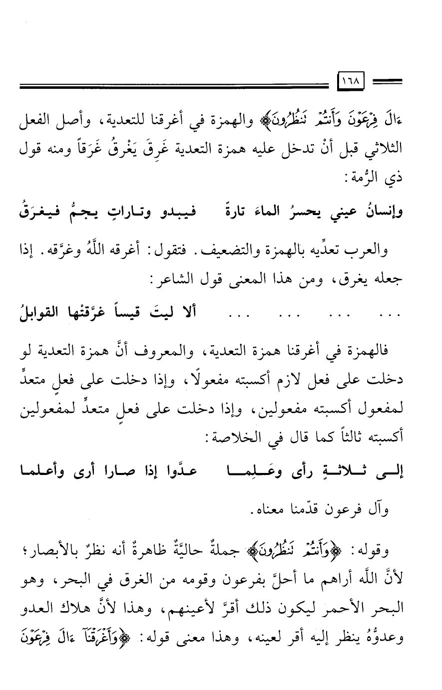 آلَ فِرْعَوْنَ وَأَنْتُمْ تَنْظُرُونَ} والهمزة في أغرقنا للتعدية، وأصل الفعل الثلاثي قبل أنْ تدخل عليه همزة التعدية غَرِقَ يَغْرقُ غَرَقًا ومنه قول ذي الرُّمة: