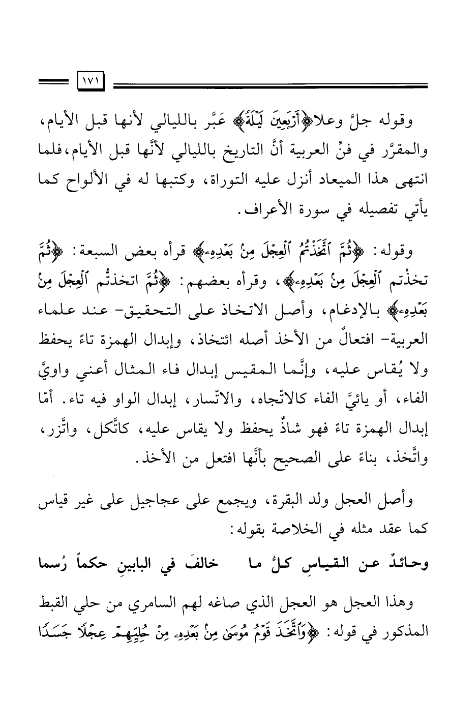وقوله: {ثُمَّ اتَّخَذْتُمُ الْعِجْلَ مِنْ بَعْدِهِ} قرأه بعض السبعة: {ثُمَّ تخَذْتم الْعِجْلَ مِنْ بَعْدِهِ}، وقرأه بعضهم: {ثُمَّ اتخذتُّم الْعِجْلَ مِنْ بَعْدِهِ} بالإدغام، وأصل الاتخاذ على التحقيق -عند علماء العربية- افتعالٌ من الأخذ أصله ائتخاذ، وإبدال الهمزة تاءً يحفظ ولا يُقاس عليه، وإنَّما المقيس إبدال فاء المثال أعني واويَّ الفاء، أو يائيَّ الفاء كالاتّجاه، والاتّسار، إبدال الواو فيه تاء. أمّا إبدال الهمزة تاءً فهو شاذٌ يحفظ ولا يقاس عليه، كاتَّكل، واتَّزر، واتَّخذ، بناء على الصحيح بأنَّها افتعل من الأخذ.