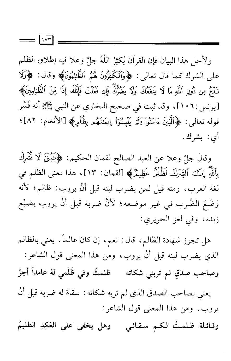 ولأجل هذا البيان فإن القرآن يُكثِرُ اللهُ جلَّ وعلا فيه إطلاق الظلم على الشِّرك كما قال تعالى: {وَالْكَافِرُونَ هُمُ الظَّالِمُونَ} وقال: {وَلَا تَدْعُ مِنْ دُونِ اللَّهِ مَا لَا يَنْفَعُكَ وَلَا يَضُرُّكَ فَإِنْ فَعَلْتَ فَإِنَّكَ إِذًا مِنَ الظَّالِمِينَ} [يونس: 106] , وقد ثبت في صحيح البُخَارِي عن النَّبِي - صلى الله عليه وسلم - أنَّه فَسَّر قوله تعالى: {الَّذِينَ آمَنُوا وَلَمْ يَلْبِسُوا إِيمَانَهُمْ بِظُلْمٍ} [الأنعام: 82]؛ أي: بشرك.