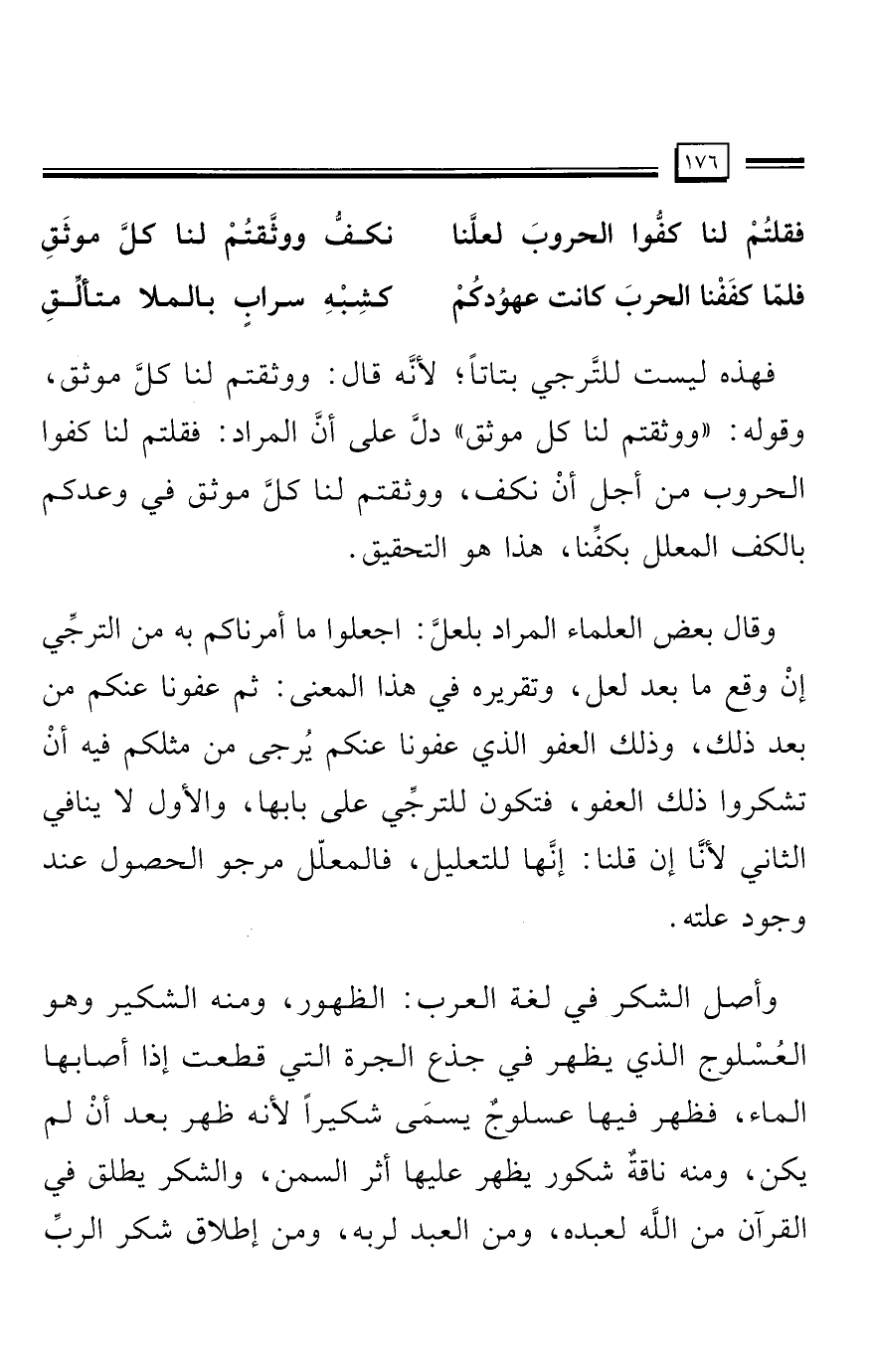 فهذه ليست للتَّرجي بتاتًا؛ لأنه قال: ووثقتم لنا كلَّ موثق، وقوله: "ووثقتم لنا كل موثق" دلَّ على أنَ المراد: فقلتم لنا كفوا الحروب من أَجل أنْ نكف، ووثقتم لنا كل موثق في وعدكم بالكف المعلل بكفنا، هذا هو التحقيق.