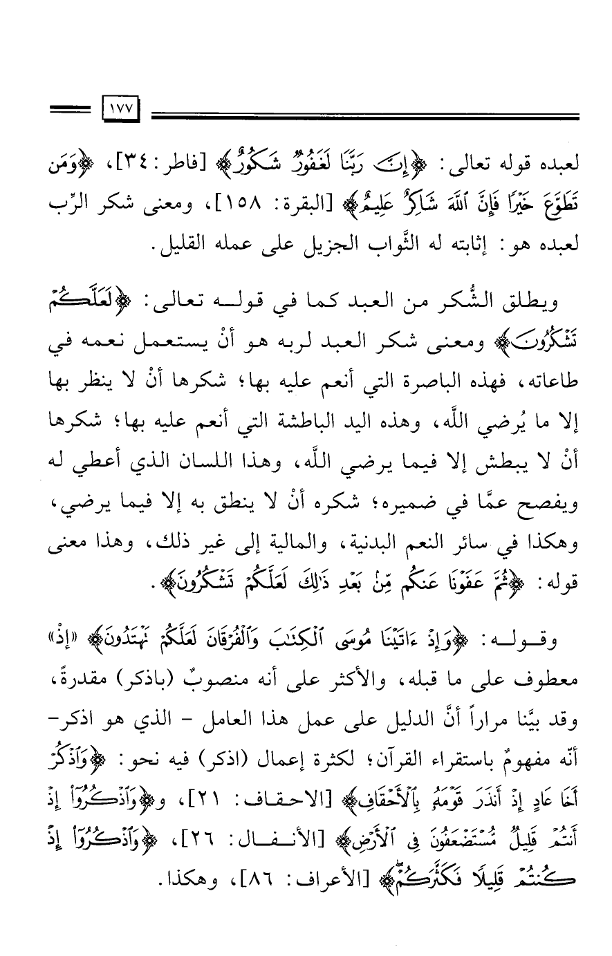 ويطلق الشُّكر من العبد كما في قوله تعالى: {لَعَلَّكُمْ تَشْكُرُونَ} ومعنى شكر العبد لربه هو أنْ يستعمل نعمه في طاعاته، فهذه الباصرة التي أنعم عليه بها؛ شكرها أنْ لا ينظر بها إلَّا ما يُرضي الله، وهذه اليد الباطشة التي أنعم عليه بها؛ شكرها أنْ لا يبطش إلَّا فيما يرضي الله، وهذا اللسان الذي أعطي له ويفصح عمَّا في ضميره؛ شكره أنْ لا ينطق به إلَّا فيما يرضي، وهكذا في سائر النعم البدنية، والمالية إلى غير ذلك، وهذا معنى قوله: {ثُمَّ عَفَوْنَا عَنْكُمْ مِنْ بَعْدِ ذَلِكَ لَعَلَّكُمْ تَشْكُرُونَ}.