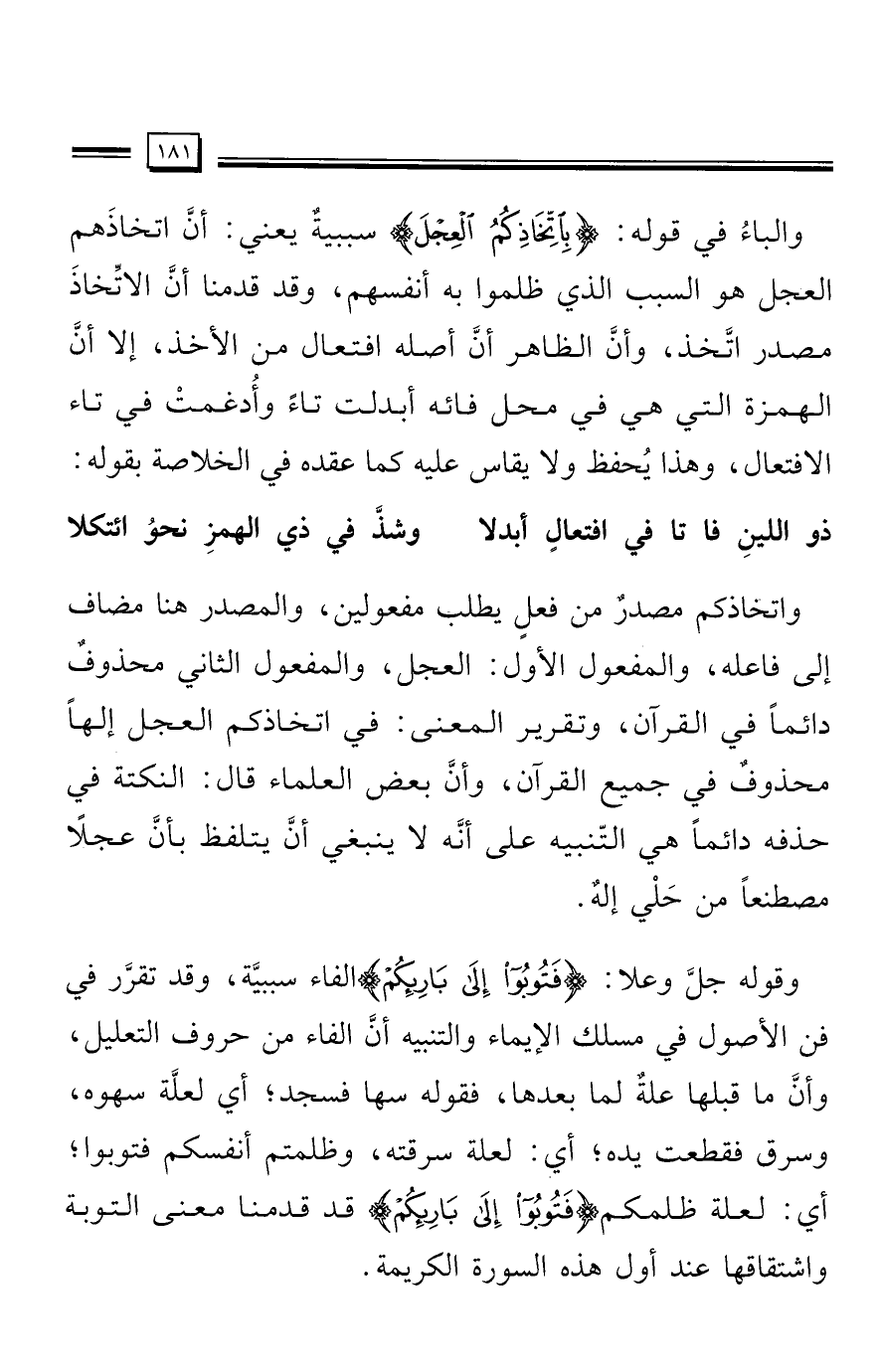 واتخاذكم مصدرٌ من فعل يطلب مفعولين، والمصدر هنا مضاف إلى فاعله، والمفعول الأول: العجل، والمفعول الثاني محذوفٌ دائمًا في القرآن، وتقرير المعنى: في اتخاذكم العجل إلهًا محذوفٌ في جميع القرآن، وأن بعض العلماء قال: النكتة في حذفه دائمًا هي التّنبيه على أنَّه لا ينبغي أن يتلفظ بأنَّ عجلًا مصطنعًا من حَلْي إلهٌ.