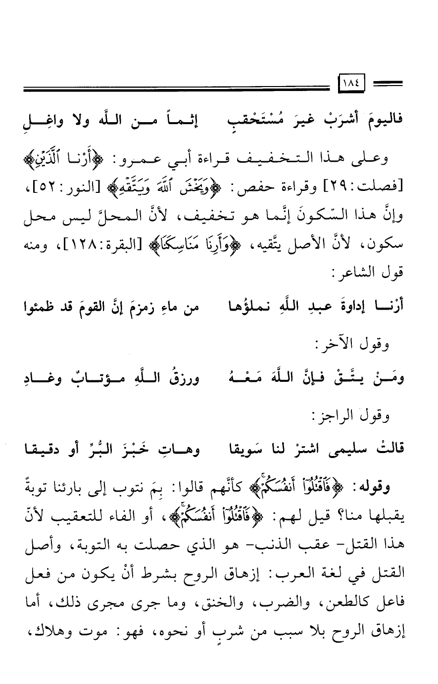 وعلى هذا التَّخفيف قراءة أبي عمرو: {أَرِنَا اللَّذَيْنِ} [فصلت: 29] وقراءة حفص: {وَيَخْشَ اللَّهَ وَيَتَّقْهِ} [النور: 52] وإنَّ هذا السّكونَ إنّما هو تخفيف؛ لأنَّ المحلَّ ليس محل سكون؛ لأنَّ الأصل يتَّقيه، {وَأَرِنَا مَنَاسِكَنَا} [البقرة: 128]، ومنه قول الشَّاعر: