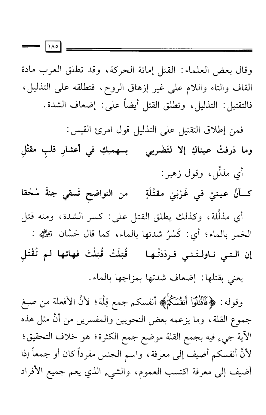 وقال بعض العلماء: القتل إماتة الحركة، وقد تطلق العرب مادة القاف والتاء والسلام على غير إزهاق الروح، فتطلقه على التذليل، فالتقتيل: التذليل، وتطلق القتل أَيضًا على: إضعاف الشدة.