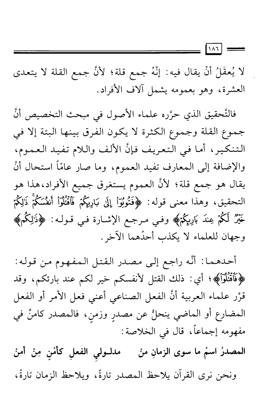 فالتَّحقيق الذي حرَّره علماء الأصول في مبحث التخصيص أنَّ جموع القلة وجموع الكثرة لا يكون الفرق بينها البتة إلَّا في التنكير، أما في التعريف فإن الألف واللام تفيد العموم، والإضافة إلى المعارف تفيد العموم، وما صار عامًّا استحال أنْ يقال هو جمع قلة؛ لأن العموم يستغرق جميع الأفراد، هذا هو التحقيق، وهذا معنى قوله: {فَتُوبُوا إِلَى بَارِئِكُمْ فَاقْتُلُوا أَنْفُسَكُمْ ذَلِكُمْ خَيْرٌ لَكُمْ عِنْدَ بَارِئِكُمْ} وفي مرجع الإشارة في قوله: {ذَلِكُمْ} وجهان للعلماء لا يكذب أحدُهما الآخر.