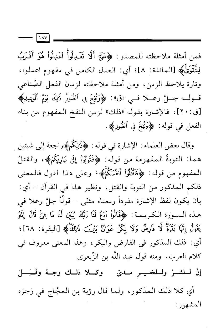 فمن أمثلة ملاحظته للمصدر: {عَلَى أَلَّا تَعْدِلُوا اعْدِلُوا هُوَ أَقْرَبُ لِلتَّقْوَى} [المائدة: 8]؛ أي: العدل الكامن في مفهوم اعدلوا، وتارة يلاحظ الزمن، ومن أمثلة ملاحظته لزمان الفعل الصِّناعي قوله جلَّ وعلا في "ق": {وَنُفِخَ فِي الصُّورِ ذَلِكَ يَوْمُ الْوَعِيدِ} [ق: 20]، فالإشارة بقوله "ذلك" لزمن النفخ المفهوم من بناء الفعل في قوله: {وَنُفِخَ فِي الصُّورِ}.