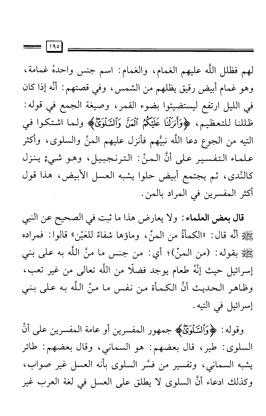 لهم فظلل الله عليهم الغمام، والغمام: اسم جنس واحدهُ غمامة، وهو غمام أبيض رقيق يظلهم من الشَّمس، وفي قصتهم: أنَّه إذا كان في الليل ارتفع ليستضيئوا بضوء القمر، وصيغة الجمع في قوله: ظللنا للتعظيم، {وَأَنْزَلْنَا عَلَيْكُمُ الْمَنَّ وَالسَّلْوَى} ولما اشتكوا في التيه من الجوع دعا الله نبيهم فأنزل عليهم المنَّ والسلوى، وأكثر علماء التفسير على أن المنَّ: الترنجبيل، وهو شيءٌ ينزل كالندى، ثم يجتمع أبيض حلوًا يشبه العسل الأبيض، هذا قول أكثر المفسرين في المراد بالمن.