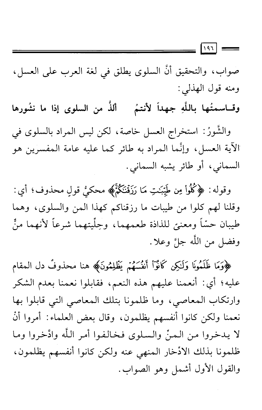 صواب، والتحقيق أنَّ السلوى يطلق في لغة العرب على العسل، ومنه قول الهذلي: