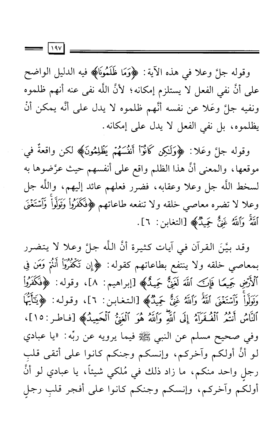 وقد بيَّنَ القرآن في آيات كثيرة أن الله جلَّ وعلا لا يتضرر بمعاصي خلقه ولا ينتفع بطاعاتهم كقوله: {إِنْ تَكْفُرُوا أَنْتُمْ وَمَنْ فِي الْأَرْضِ جَمِيعًا فَإِنَّ اللَّهَ لَغَنِيٌّ حَمِيدٌ} [إبراهيم: 8]، وقوله: {فَكَفَرُوا وَتَوَلَّوْا وَاسْتَغْنَى اللَّهُ وَاللَّهُ غَنِيٌّ حَمِيدٌ} [التغابن: 6]، وقوله: {يَاأَيُّهَا النَّاسُ أَنْتُمُ الْفُقَرَاءُ إِلَى اللَّهِ وَاللَّهُ هُوَ الْغَنِيُّ الْحَمِيدُ} [فاطر: 15]، وفي صحيح مسلم عن النبي - صلى الله عليه وسلم - فيما يرويه عن ربِّه: "يَا عبادي لو أنَّ أولكم وآخركم، وإنسكم وجنكم كانوا على أتقى قلبِ رجلٍ واحد منكم، ما زاد ذلك في مُلكي شيئًا، يَا عبادي لو أنَّ أولكم وآخركم، وإنسكم وجنكم كانوا على أفجر قلبِ رجلٍ