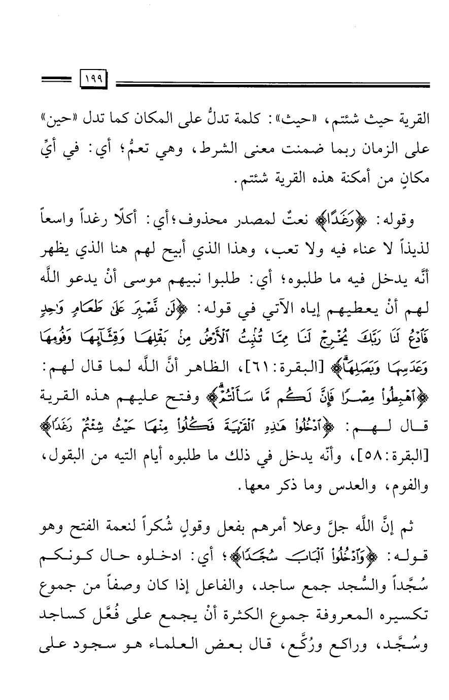 وقوله: {رَغَدًا} نعتٌ لمصدر محذوف؛ أي: أكلًا رغدًا واسعًا لذيذًا لا عناء فيه ولا تعب، وهذا الذي أبيح لهم هنا الذي يظهر أنَّه يدخل فيه ما طلبوه؛ أي: طلبوا نبيهم موسى أنْ يدعو الله لهم أنْ يعطيهم إياه الآتي في قوله: {لَنْ نَصْبِرَ عَلَى طَعَامٍ وَاحِدٍ فَادْعُ لَنَا رَبَّكَ يُخْرِجْ لَنَا مِمَّا تُنْبِتُ الْأَرْضُ مِنْ بَقْلِهَا وَقِثَّائِهَا وَفُومِهَا وَعَدَسِهَا وَبَصَلِهَا} [البقرة: 61] , الظاهر أن الله لما قال لهم: {اهْبِطُوا مِصْرًا فَإِنَّ لَكُمْ مَا سَأَلْتُمْ} وفتح عليهم هذه القرية قال لهم: {ادْخُلُوا هَذِهِ الْقَرْيَةَ فَكُلُوا مِنْهَا حَيْثُ شِئْتُمْ رَغَدًا} [البقرة: 58] , وأنّه يدخل في ذلك ما طلبوه أيام التيه من البقول، والفوم، والعدس وما ذكر معها.