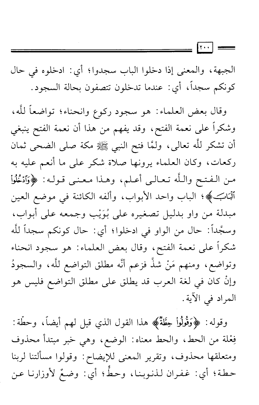 وقال بعض العلماء: هو سجود ركوع وانحناء؛ تواضعًا لله، وشكرًا على نعمة الفتح، وقد يفهم من هذا أن نعمة الفتح ينبغي أن تشكر لله تعالى، ولمَّا فتح النَّبِي - صلى الله عليه وسلم - مكة صلى الضحى ثمان ركعات، وكان العلماء يرونها صلاة شكر على ما أنعم عليه به من الفتح والله تعالى أعلم، وهذا معنى قوله: {وَادْخُلُوا الْبَابَ}؛ الباب واحد الأبواب، وألفه الكائنة في موضع العين مبدلة من واو بدليل تصغيره على بُوَيْب وجمعه على أبواب، وسجَّدًا: حال من الواو في ادخلوا؛ أي: حال كونكم سجدًا لله شكرًا على نعمة الفتح، وقال بعض العلماء: هو سجود انحناء وتواضع، ومنهم مَنْ شذَّ فزعم أنَّه مطلق التواضع لله، والسجودُ وإنْ كان في لغة العرب قد يطلق على مطلق التواضع فليس هو المراد في الآية.