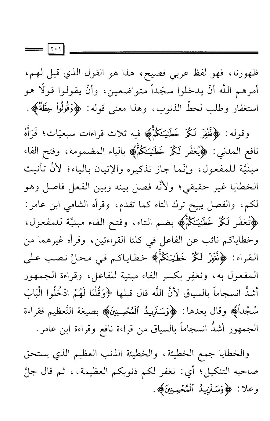 وقوله: {نَغْفِرْ لَكُمْ خَطَايَاكُمْ} فيه ثلاث قراءات سبعيّات؛ قَرَأَهُ نافع المدني: {يُغْفَرْ لَكُمْ خَطَايَاكُمْ} بالياء المضمومة، وفتح الفاء مبنيَّة للمفعول، وإنّما جاز تذكيره والإتيان بالياء؛ لأن تأنيث الخطايا غير حقيقي؛ ولأنه فصل بينه وبين الفعل فاصل وهو لكم، والفصل يبيح ترك التاء كما تقدم، وقرأه الشامي ابن عامر: {تُغْفَرْ لَكُمْ خَطَايَاكُمْ} بضم التاء، وفتح الفاء مبنية للمفعول، وخطاياكم نائب عن الفاعل في كلتا القراءتين، وقرأه غيرهما من القراء: {نَغْفِرْ لَكُمْ خَطَايَاكُمْ} خطاياكم في محلِّ نصب على المفعول به، ونغفِر بكسر الفاء مبنية للفاعل، وقراءة الجمهور أشدُّ انسجامًا بالسياق لأنَّ الله قال قبلها {وَقُلْنَا لَهُمُ ادْخُلُوا الْبَابَ سُجَّدًا} وقال بعدها: {وَسَنَزِيدُ الْمُحْسِنِينَ} بصيغة التَّعظيم فقراءة الجمهور أشدُّ انسجامًا بالسياق من قراءة نافع وقراءة ابن عامر.
