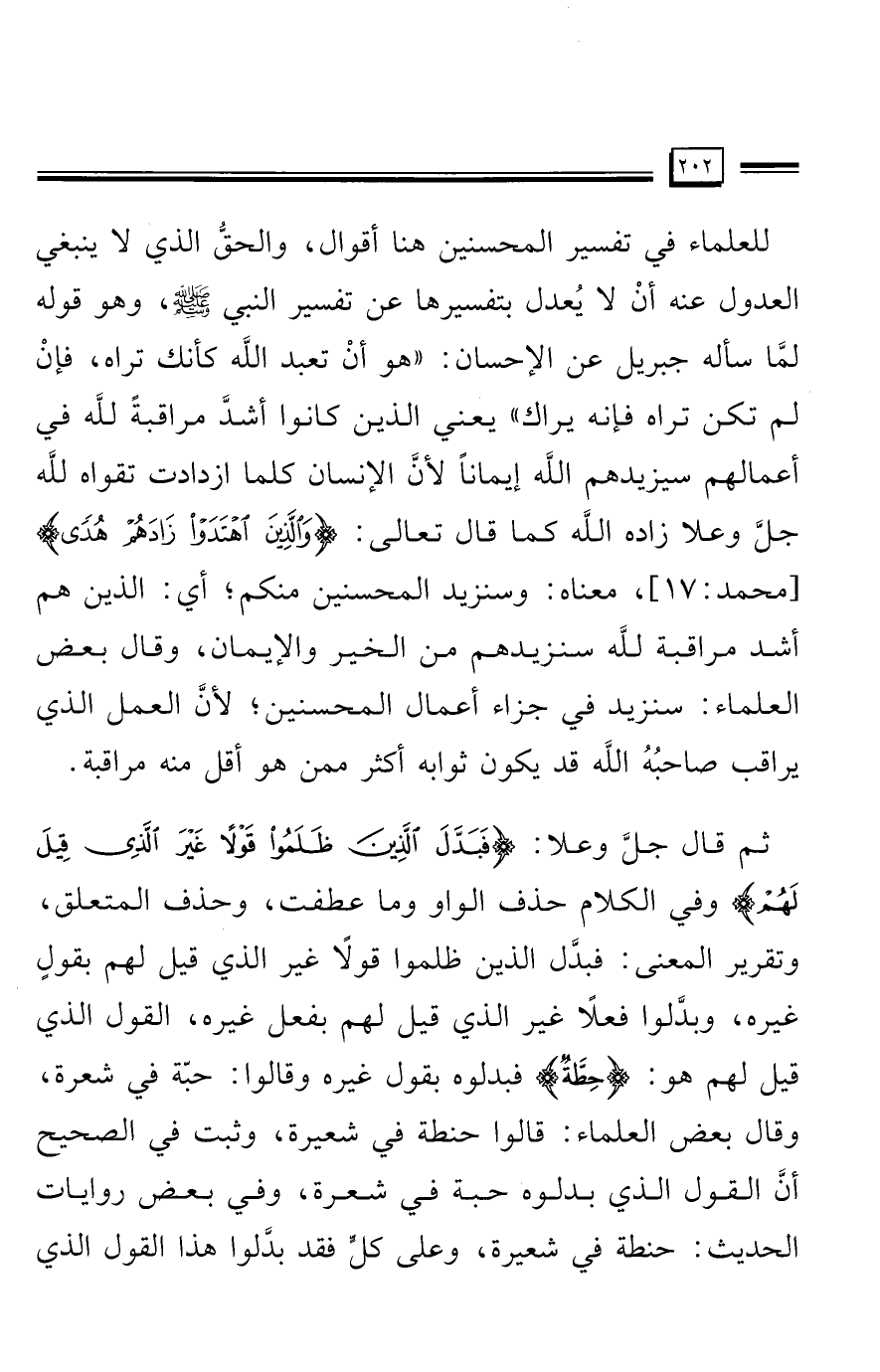 للعلماء في تفسير المحسنين هنا أقوال، والحقُّ الذي لا ينبغي العدول عنه أنْ لا يُعدل بتفسيرها عن تفسير النبي - صلى الله عليه وسلم -، وهو قوله لمَّا سأله جبريل عن الإحسان: "هو أنْ تعبد الله كأنك تراه، فإنْ لم تكن تراه فإنه يراك" يعني الذين كانوا أشدَّ مراقبةً لله في أعمالهم سيزيدهم الله إيمانًا لأن الإنسان كلما ازدادت تقواه لله جلَّ وعلا زاده الله كما قال تعالى: {وَالَّذِينَ اهْتَدَوْا زَادَهُمْ هُدًى} [محمد: 17]، معناه: وسنزيد المحسنين منكم؛ أي: الذين هم أشد مراقبة لله سنزيدهم من الخير والإيمان، وقال بعض العلماء: سنزيد في جزاء أعمال المحسنين؛ لأن العمل الذي يراقب صاحبُهُ الله قد يكون ثوابه أكثر ممن هو أقل منه مراقبة.