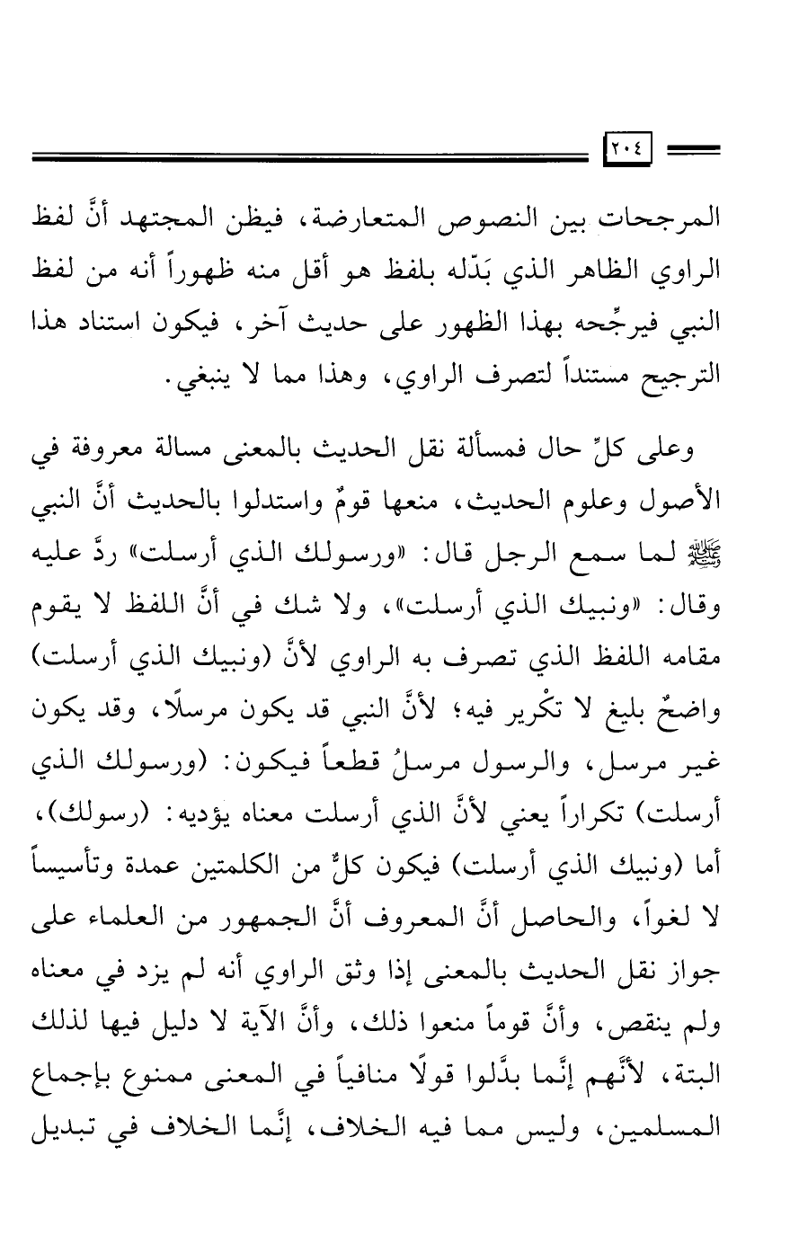 وعلى كلِّ حال فمسألة نقل الحديث بالمعنى مسألة معروفة في الأصول وعلوم الحديث، منعها قومٌ واستدلوا بالحديث أنَّ النبي - صلى الله عليه وسلم - لما سمع الرجل قال: "ورسولك الذىِ أرسلت" ردَّ عليه وقال: "ونبيك الذي أرسلت"، ولا شك في أنَّ اللفظ لا يقوم مقامه اللفظ الذي تصرف به الراوي لأنَّ (ونبيك الذي أرسلت) واضحٌ بليغ لا تكْرير فيه؛ لأنَّ النبي قد يكون مرسلا، وقد يكون غير مرسل، والرسول مرسلُ قطعًا فيكون: (ورسولك الذي أرسلت) تكرارًا يعني لأنَّ الذي أرسلت معناه يؤديه: (رسولك)، أما (ونبيك الذي أرسلت) فيكون كلُّ من الكلمتين عمدة وتأسيسًا لا لغوًا، والحاصل أنَّ المعروف أنَّ الجمهور من العلماء على جواز نقل الحديث بالمعنى إذا وثق الراوي أنه لم يزد في معناه ولم ينقص، وأنَّ قومًا منعوا ذلك، وأنَّ الآية لا دليل فيها لذلك البتة، لأنَّهم إنَّما بدَّلوا قولا منافيًا في المعنى ممنوع بإجماع المسلمين، وليس مما فيه الخلاف، إنَّما الخلاف في تبديل