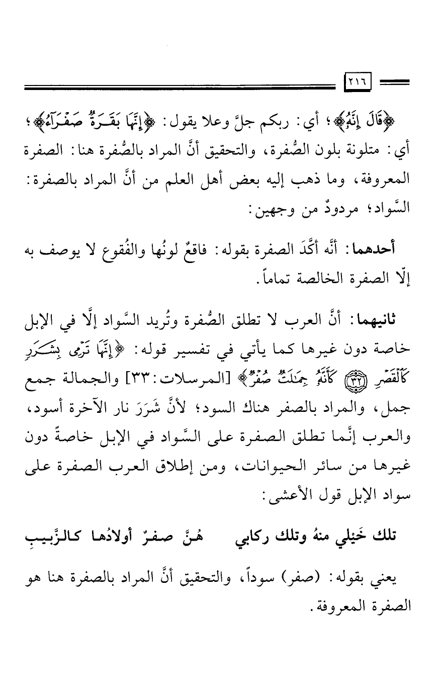 ثانيهما: أنَّ العرب لا تطلق الصُّفرة وتُريد السَّواد إلَّا في الإبل خاصة دون غيرها كما يأتي في تفسير قوله: {أنَّهَا تَرْمِي بِشَرَرٍ كَالْقَصْرِ (32) كَأَنَّهُ جِمَالَتٌ صُفْرٌ} [المرسلات: 32 - 33] والجمالة جمع جمل، والمراد بالصفر هناك السود؛ لأن شَرَرَ نار الآخرة أسود، والعرب إنَّما تطلق الصفرة على السَّواد في الإبل خاصة دون غيرها من سائر الحيوانات، ومن إطلاق العرب الصفرة على سواد الإبل قول الأعشى: