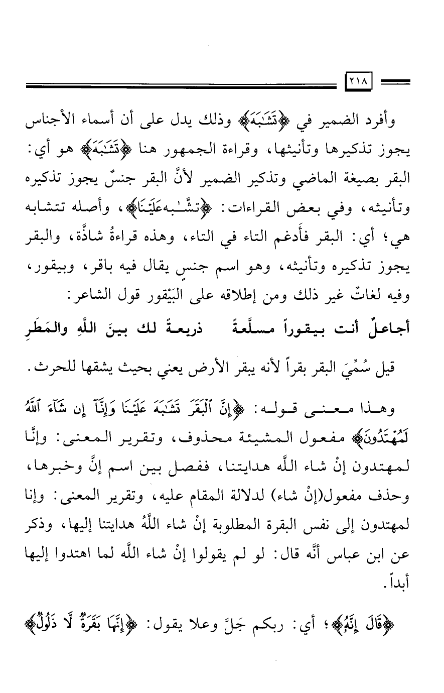 وأفرد الضمير في {تَشَابَهَ} وذلك يدل على أن أسماء الأجناس يجوز تذكيرها وتأنيثها، وقراءة الجمهور هنا {تَشَابَهَ} هو أي: البقر بصيغة الماضي وتذكير الضمير لأن البقر جنسٌ يجوز تذكيره وتأنيثه، وفي بعض القراءات: {تَشَابَهَ عَلَيْنَا}، وأصله تتشابه هي؛ أي: البقر فأَدغم التاء في التاء، وهذه قراءةُ شاذة، والبقر يجوز تذكيره وتأنيثه، وهو اسم جنسٍ يقال فيه باقر، وبيقور، وفيه لغاتٌ غير ذلك ومن إطلاقه على البَيْقور قول الشاعر: