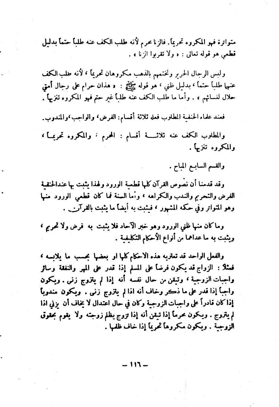 فالزنا محرم لأنه طلب الكف عنه طلبا حتما بدلي لقطعي هو قوله تعالى: {وَلاَ تَقْرَبُواْ الزِّنَى} [الإسراء: 32؟] . ولبس الرجال الحرير وتختمهم بالذهب مكروهان تحريما، لأنه طلب الكف عنهما طلبا حتما، بدليل ظني، هو قوله صلى الله عليه وسلم: "هذان حرام على رجال أمتي حلال لنسائهم"، وأما ما طلب الكف عنه طلبا غير حتم فهو المكروه تنزيها.