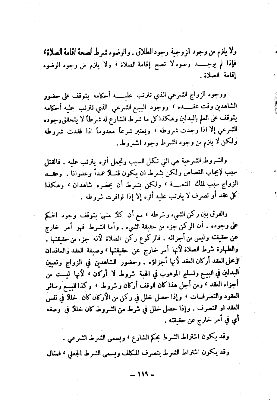 ووجود الزواج الشرعي الذي تترتب عليه أحكامه يتوقف على حضور الشاهدين وقت عقده، ووجود البيع الشرعي الذي تترتب عليه أحكامه يتوقف على العلم بالبدلين، وهكذا كل ما شرط الشارع له شرطا لا يتحقق وجوده الشرعي إلا إذا وجدت شروطه، ويعتبر شرعا معدوما إذا فقدت شروطه ولكن لا يلزم من وجود الشرط وجود المشروط.