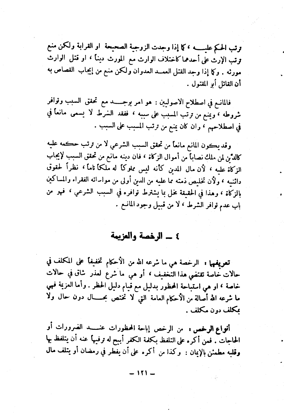 ترتب الحكم عليه، كما إذا وجدت الزوجية الصحيحة أو القرابة ولكن منع ترتب الإرث على أحدهما كاختلاف الوارث مع المورث دينا، أو قتل الوارث مورثه، وكما إذا وجد القتل العمد العدوان ولكن منع من إيجاب القصاص به أن القاتل أبو المقتول.