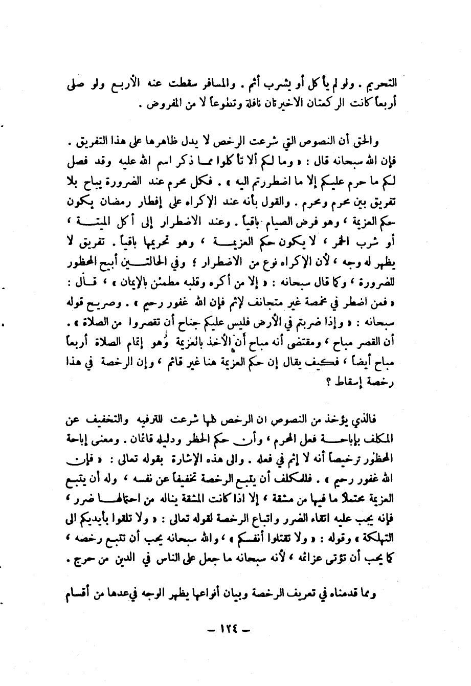 والحق أن النصوص التي شرعت الرخص لا يدخل ظاهرها على هذا التفريق، فإن الله سبحانه قال: {وَمَا لَكُمْ أَلاَّ تَأْكُلُواْ مِمَّا ذُكِرَ اسْمُ اللهِ عَلَيْهِ وَقَدْ فَصَّلَ لَكُم مَّا حَرَّمَ عَلَيْكُمْ إِلاَّ مَا اضْطُرِرْتُمْ إِلَيْهِ} [الأنعام: 119] ، فكل محرم عند الضرورة يباح بلا تفريق بين محرم ومحرم.