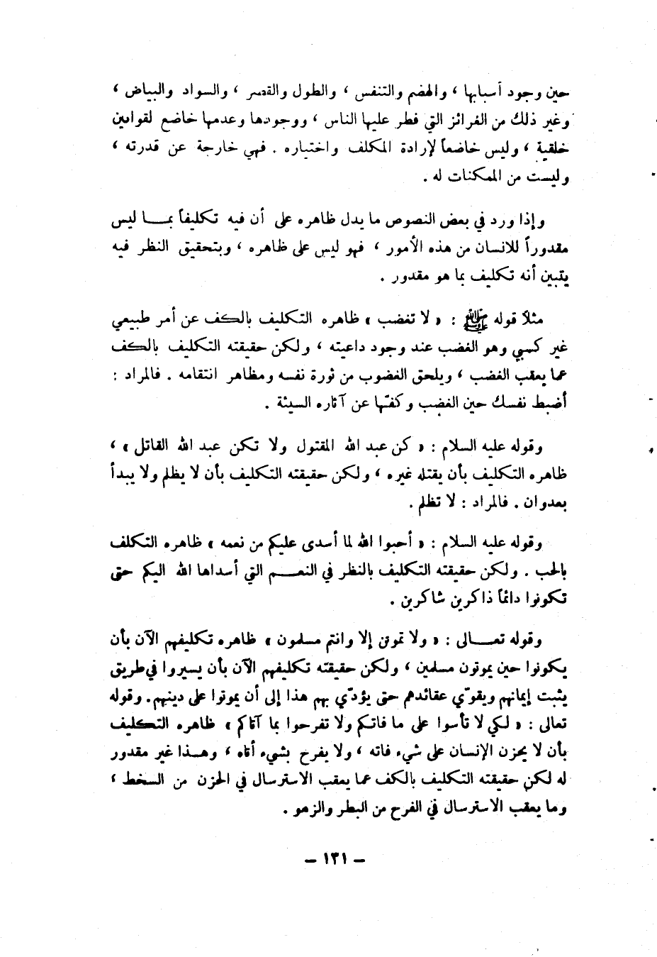 وإذا ورد في بعض النصوص ما يدل ظاهره على أن فيه تكليفا بما ليس مقدورا للإنسان من هذه الأمور، فهو ليس على ظاهره، وبتحقيق النظر فيه يتبين أنه تكليف بما هو مقدور.