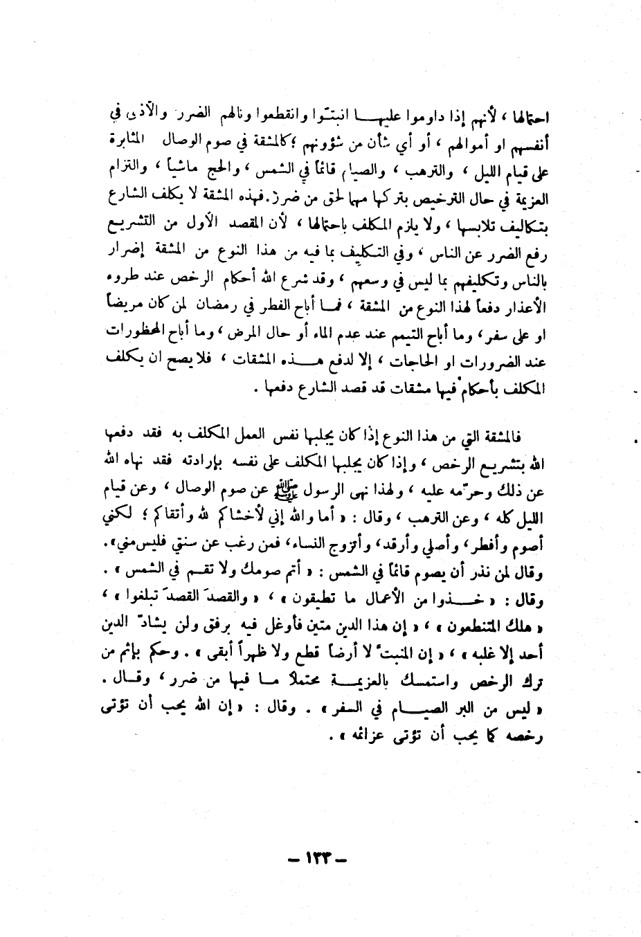 احتمالها، لأنهم إذا داوموا عليها انبتوا وانقطعوا ونالهم الضرر والأذى في أنفسهم قيام الليل، والترهب، والصيام قائماً في الشمس، والحج ماشيا، والتزام العزيمة في حال الترخيص بتركها مهما لحق من ضرر. فهذه المشقة لا يكلف الشارع بتكاليف تلابسها، ولا يلزم المكلف باحتمالها، لأن المقصد الأول رفع الضرر عن الناس، وفي التكليف بما فيه من هذا النوع من المشقة إضرار بالناس وتكليفهم بما ليس في وسعهم، وقد شعر الله أحاكم الرخص عند طروء الأعذار دفعا لهذا النوع من المشقة، فما أباح الله الفطر في رمضان لمن كان مريضا أو على سفر، وما أباح التيمم عند عدم الماء، أو حال المرض، وما أباح المحظورات عند الضرورات أو الحجات، إلا لدفع هذه المشقّات، فال يصح أن يكلف المكلف بأحكام فيها مشقات قد قصد الشارع دفعها.