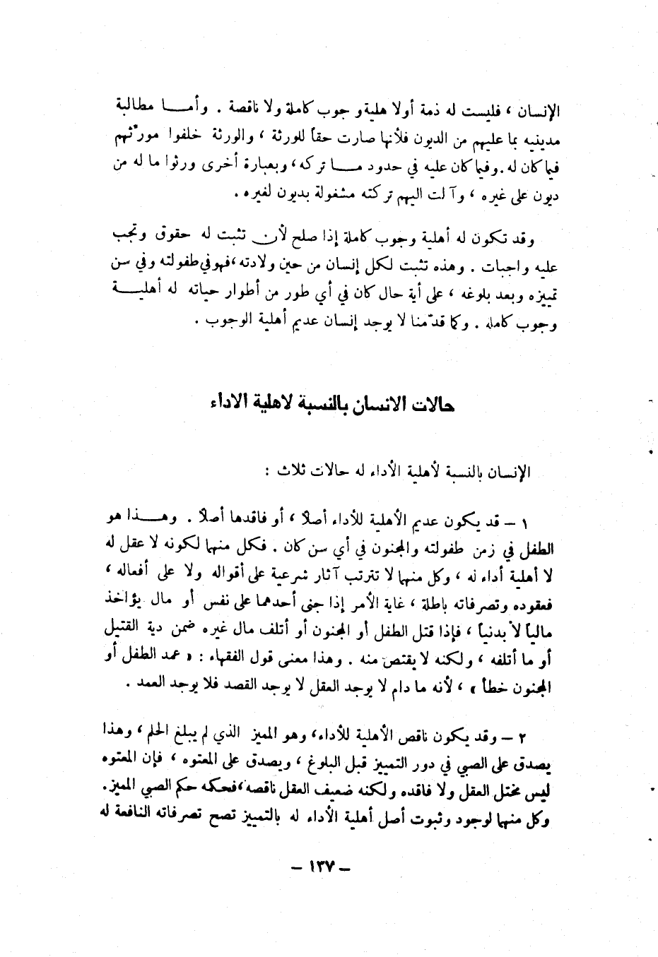 1- قد يكون عديم الأهلية للأداء أصلا، أو فاقدها أصلا. وهذا هو الطفل في زمن طفولته، والمجنون في أي سن كان. فكل منهما لكون لا عقل له لا أهلية أداء له، ولك منهما لا تترتب عليه آثار شرعية على أقواله ولا على أفعاله، فعقوده وتصرفاته باطلة، غاية الأمر إذا جنى أحدهما على نفس أو مال يؤاخذ ماليا لا بدنيا، فإن قتل الطفل أو المجنون أو أتلف مال غيره ضمن دية القتيل أو ما أتلفه، ولكنه لا يقتص منه، وهذا معنى قول الفقهاء: "عمد الطفل أو المجنون خطأ"، لأنه مادام لا يوجد العقل لا يوجد القصد فلا يوجد العمد.