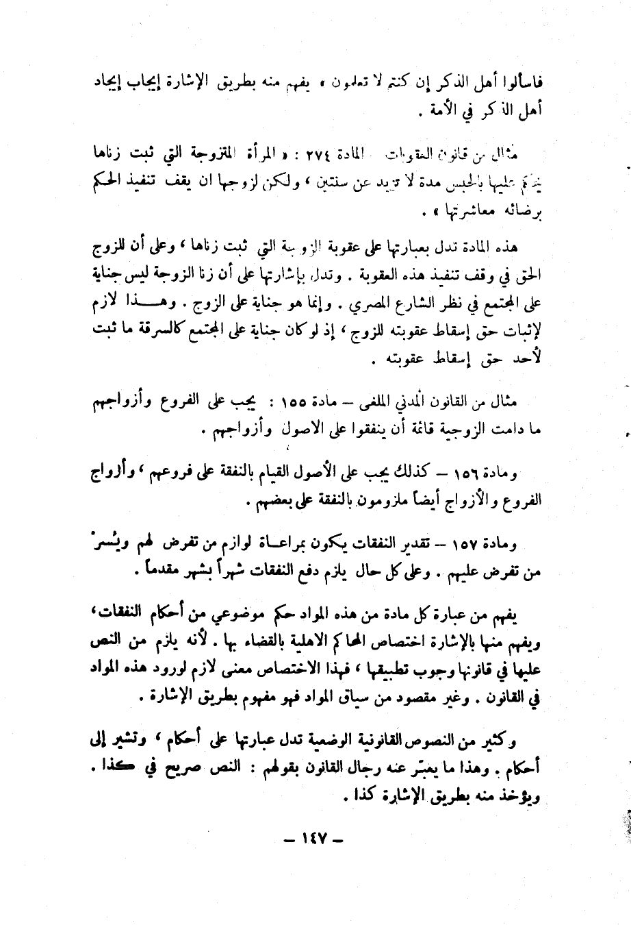 يفهم من عبارة كل مادة من هذه المواد حكم موضعي من أحكام النفقات، ويفهم منها بالإشارة اختصاص المحاكم الأهلية بالقضاء بها، لأنه يلزم من النص عليها في قانونها وجوب تطبيقها، فهذا الاختصاص معنى بالإشارة اختصاص المحاكم الأهلية بالقضاء بها، لأنه يلزم من النص عليها في قانونها وجوب تطبيقها، فهذا الاختصاص معنى لازم لورود هذه المواد في القانون، وغير مقصود من سياق المواد فهو مفهوم بطريق الإشارة.
