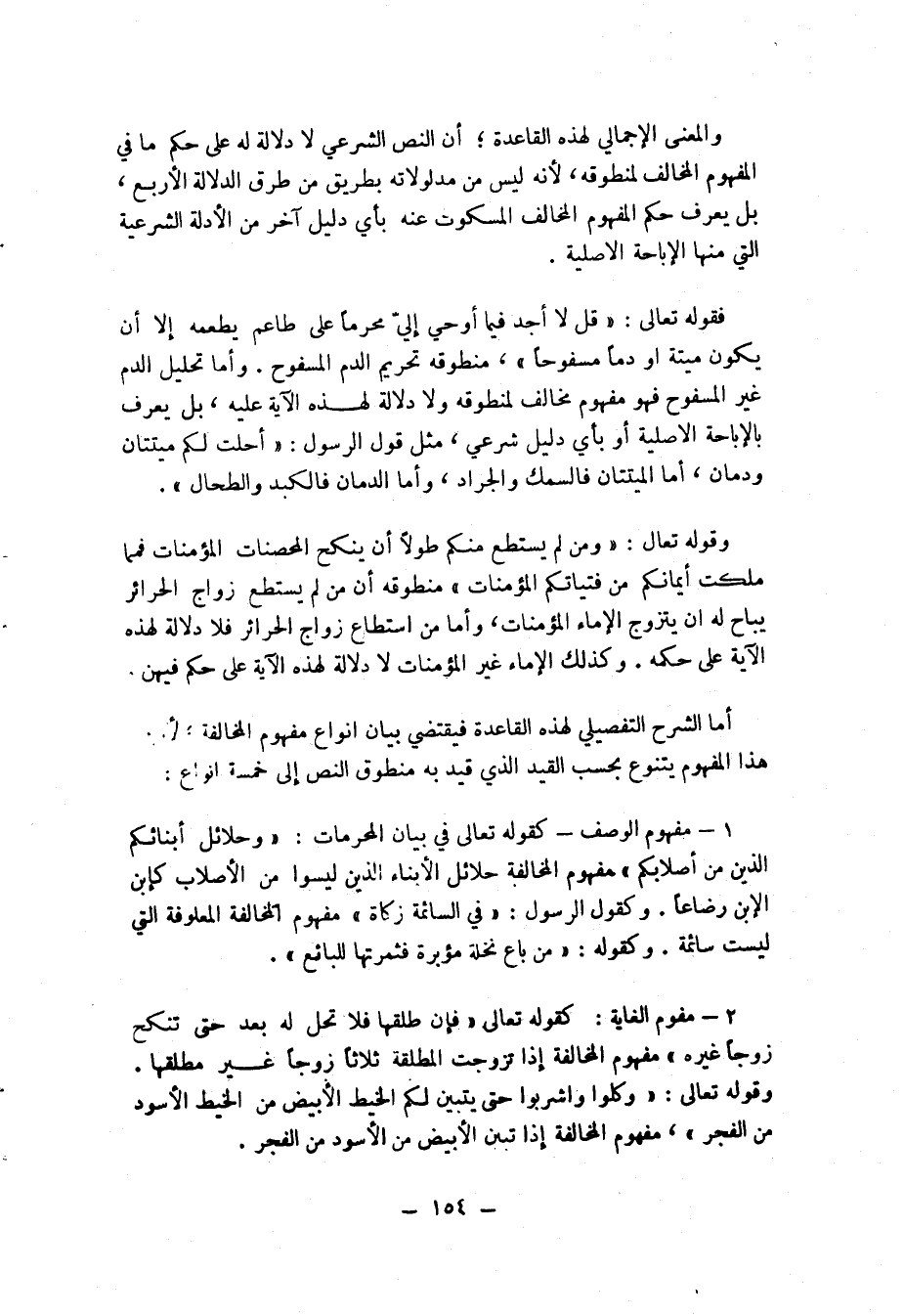 أما الشرح التفصيلي لهذه القاعدة فيقتضى بيان أنواع مفهوم المخالفة، لأن هذا المفهوم يتنوع بحسب القيد الذي قيد به منطوق النص إلى خمسة أنواع: