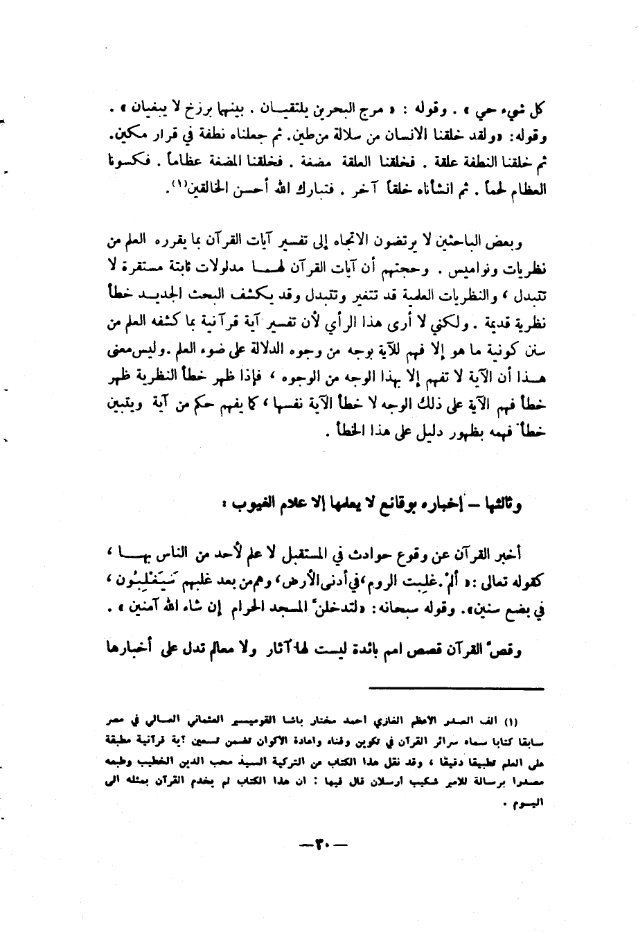 وبعض الباحثين لا يرتضون الاتجاه إلى تفسير آيات القرآن بما يقرره العلم من نظريات ونواميس، وحجتهم أن آيات القرآن لها مدلولات ثابتة مستقرة لا تتبدل، والنظريات العلمية قد تتغير وتتبدل، وقد يكشف البحث الجديد خطأ نظريات قديمة، ولكني لا أرى هذا الرأي لأن تفسير آية قرآنية بما كشفه العلم من سنن كونية ما هو إلا فهم للآية بوجه من وجوه الدلالة على ضوء العلم، وليس معنى هذا أن الآية لا تفهم إلا بهذا الوجه من الوجوه، فإذا ظهر خطأ النظرية ظهر خطأ فهم النظرية على ذلك الوجه لا خطأ الآية نفسها، كما يفهم حكم من آية ويتبين خطأ فهمه بظهور دليل على هذا الخطأ.