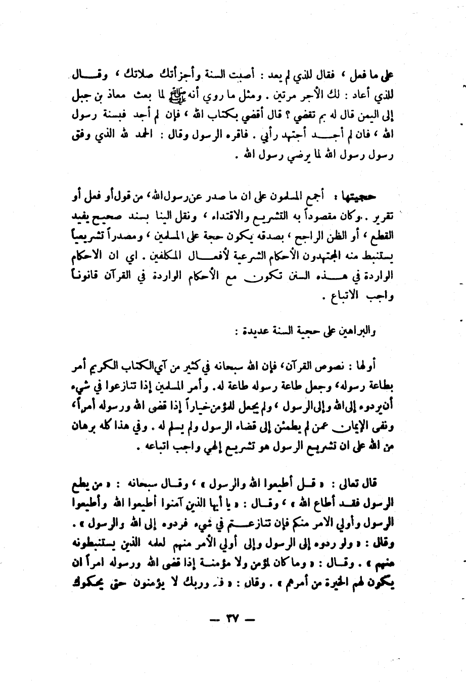 أولها: نصوص القرآن: فإن الله سبحانه في كثير من آي الكتاب الكريم أمر بطاعة رسوله طاعة له، وأمر المسلمين إذا تنازعوا في شيء أن يردوه إلى الله وإلى الرسول، ولم يجعل للمؤمن خياراً إذا قضى الله ورسوله أمراً، ونفي الإيمان عمن لم يطمئن إلى قضاء الرسول ولم يسلم له، وفي هذا كله برهان من الله على أن تشريع الرسول هو تشريع إلهي واجب اتّباعه.