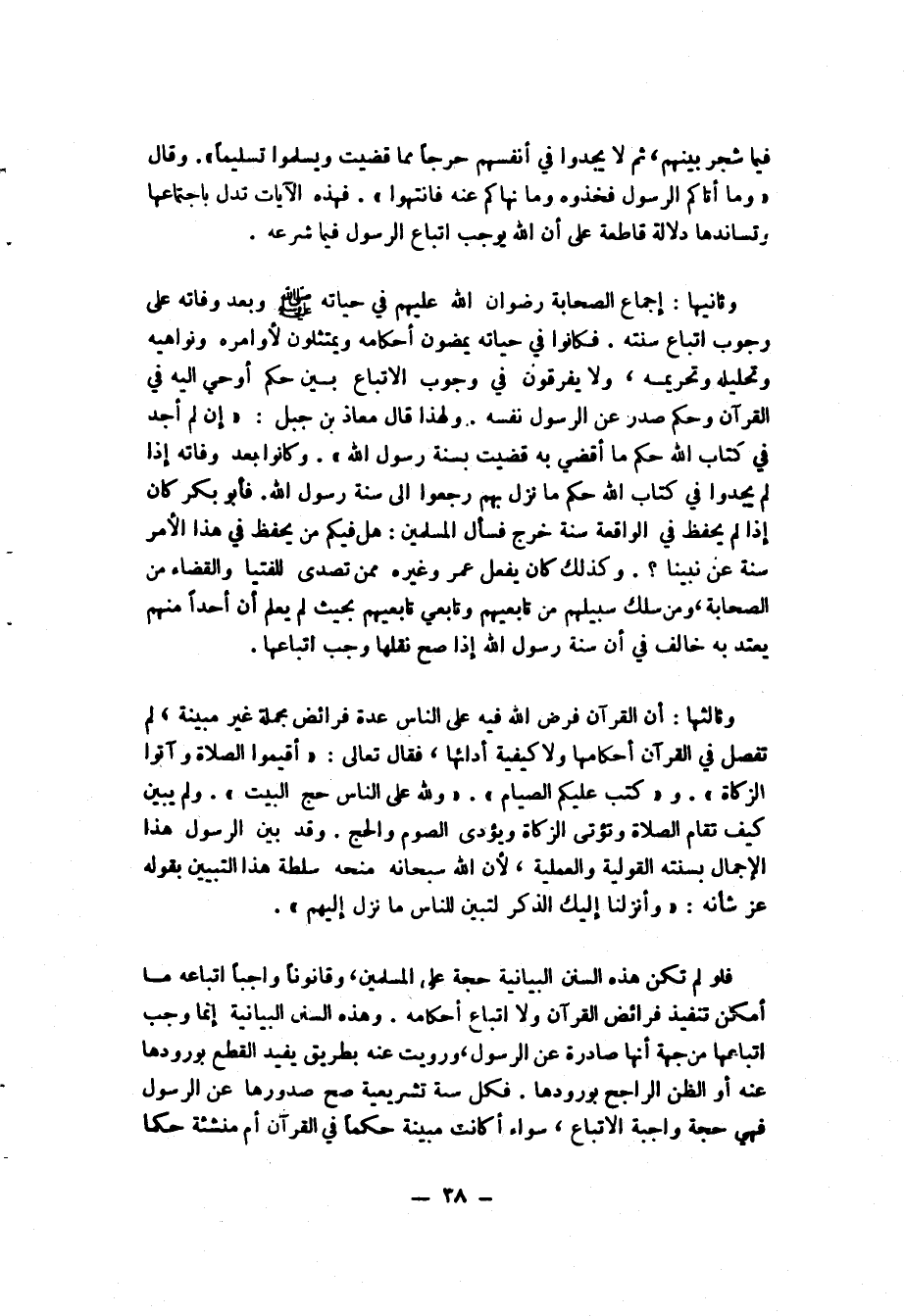 فلو لم تكن هذه السنن البيانية حجة على المسلمين، وقانوناً واجباً اتباعه ما أمكن تنفيذ فرائض القرآن ولا اتباع أحكامه. وهذه السنن البيانية إنما وجب اتباعها من جهة أنها صادرة عن الرسول، ورويت عنه بطريق يفيد القطع بورودها عنه أو الظن الراجح بورودها. فكل سنة تشريعية صح صدورها عن الرسول فهي حجة واجبة الاتباع، سواء أكانت مبينة حكماً في القرآن أم منشئة حكماً