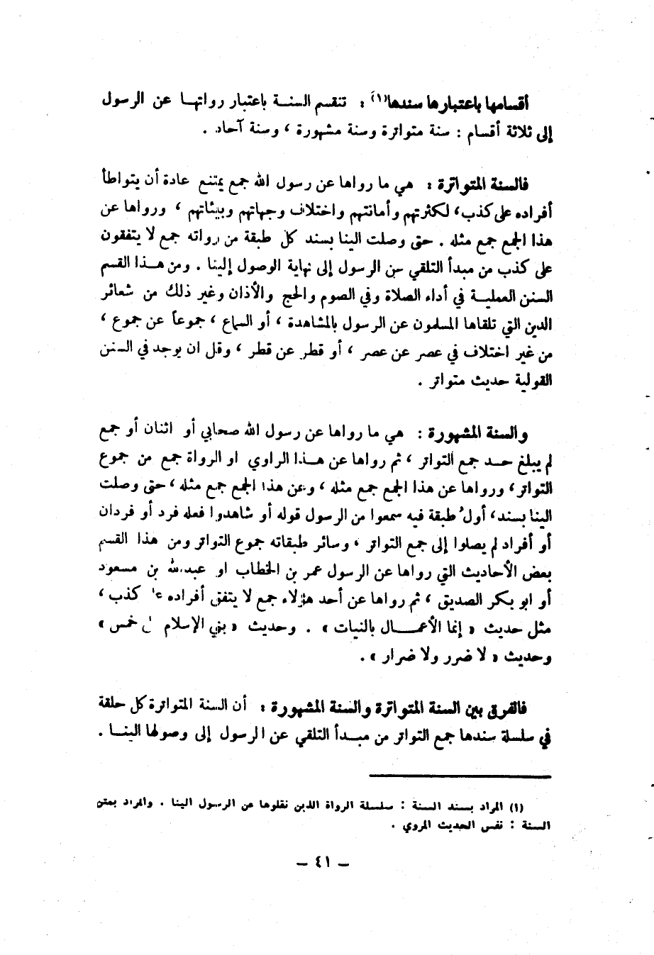 فالسنة المتواترة: هي ما رواها عن رسول الله جمع يمتنع عادة أن يتواطأ أفراده على كذب، لكثرتهم وأمانته واختلاف وجهاتهم وبيئاتهم، ورواها عن هذا الجمع جمع مثله، حتى وصلت إلينا بسند كل طبقة من رواته، جمع لا يتفقون على كذب، من مبدأ التلقي عن الرسول إلى نهاية الوصول إلينا، ومن هذا القسم السنن العملية في أداء الصلاة وفي الصوم الحج والآذان وغير ذلك من شعائر الإسلام التي تلقّاها المسلمون عن الرسول بالمشاهدة، أو السماع، جموع عن جموع، من غير اختلاف في عصر عن عصر، أو قطر عن قطر، وقل أن يوجد في السنن القولية حديث متواتر.