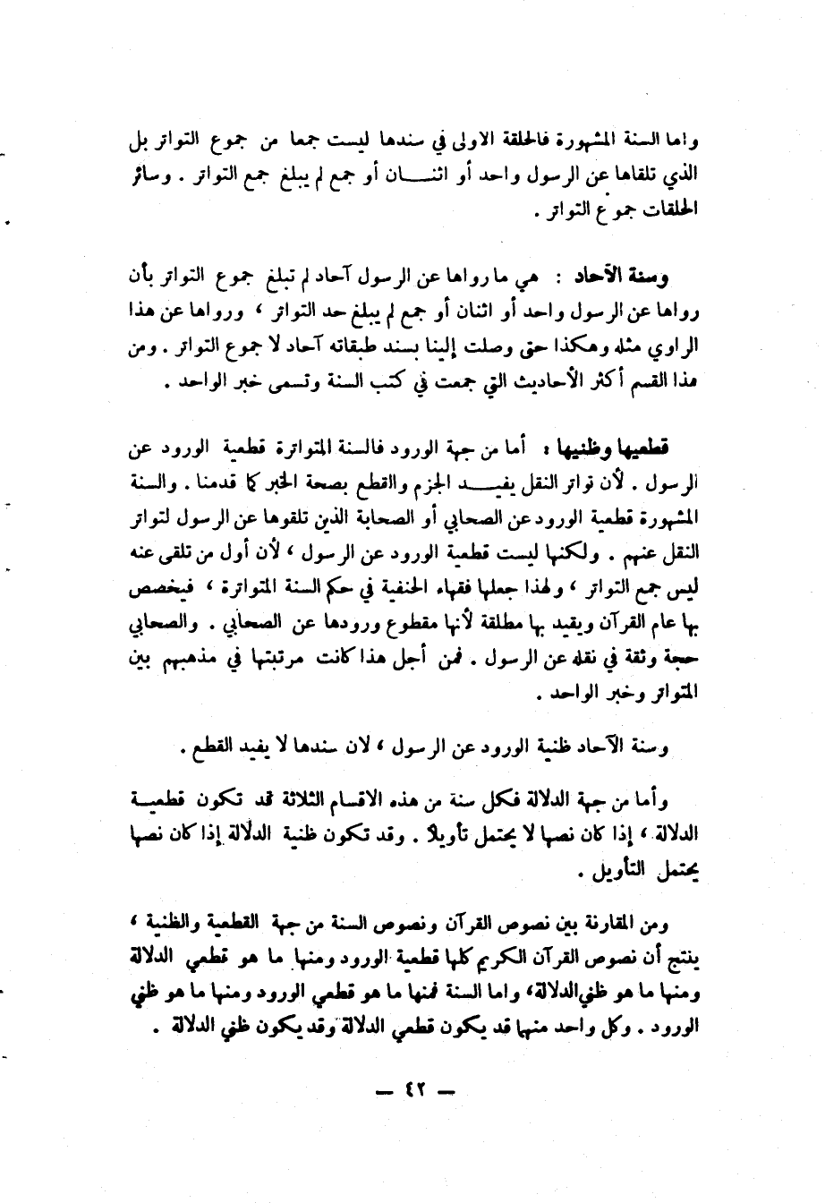 وأما السنة المشهورة فالحلقة الأولى في سندها ليست جمعاً من جموع التواتر بل الذي تلقاها عن الرسول واحد أو اثنان أو جمع لم يبلغ جمع التواتر وسائر الحلقات جموع التواتر.