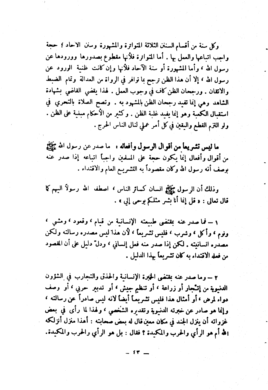 ما ليس تشريعا من أقوال الرسول وأفعاله: ما صدر عن رسول الله - صلى الله عليه وسلم - من أقوال وأفعال إنما يكون حجة على المسلمين واجبا اتّباعه إذا صدر عنه بوصف أنه رسول الله وكان مقصودا به التشريع العام والإقتداء.