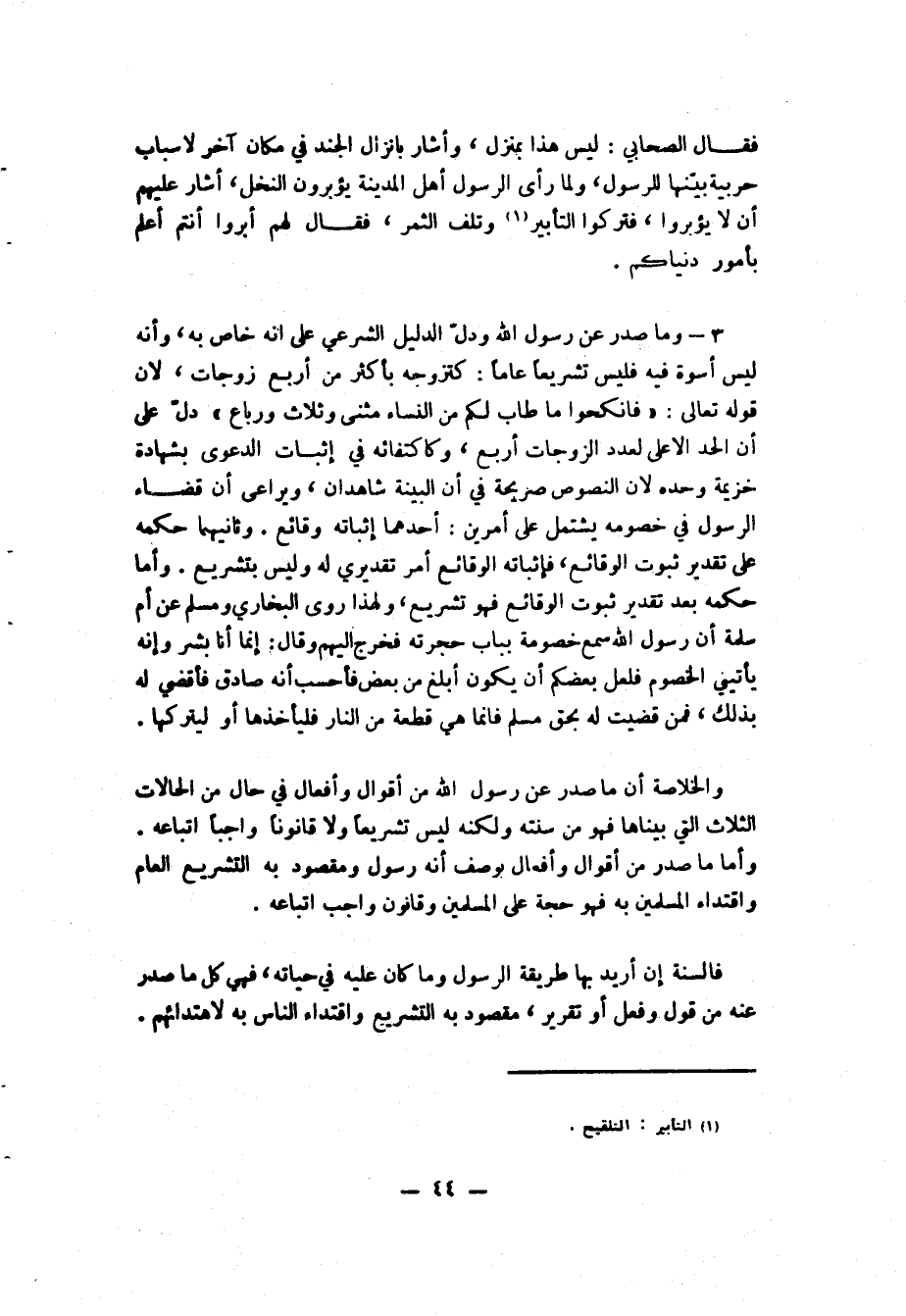 والخلاصة: أن ما صدر عن رسول الله من أقوال وأفعال في حال من الحالات الثلاثة التي بيناها فهو من سنته ولكنه ليس تشريعا ولا قانونا واجبا اتّباعه، وأما ما صدر من أقوال وأفعال بوصف أنه رسول ومقصود به التشريع العام واقتداء المسلمين به فهو حجة على المسلمين وقانون واجب اتّباعه.