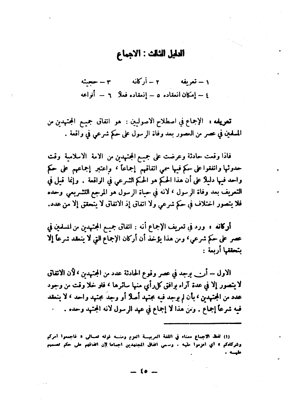 فإذا وقعت حادثة وعرضت على جميع المجتهدين من الأمة الإسلامية وقت حدوثها واتفقوا على حكم فيها سمي اتفاقهم إجماعا، واعتبر إجماعهم على حكم واحد فيها دليلا على أن هذا الحكم هو الحكم الشرعي في الواقعة، وإنما قيل في التعريف بعد وفاة الرسول، لأنه في حياة الرسول هو المرجح التشريعي وحده، فلا يتصور اختلاف في حكم شرعي ولا اتفاق إذ الاتفاق لا يتحقق إلا من عدد.