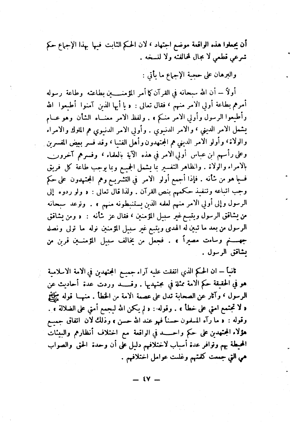 أولا: أن الله سبحانه في القرآن كما أمر المؤمنين بطاعته وطاعة رسوله أمرهم بطاعة أولى الأمر منهم، فقال تعالى: {يَا أَيُّهَا الَّذِينَ آمَنُواْ أَطِيعُواْ اللهَ وَأَطِيعُواْ الرَّسُولَ وَأُوْلِي الأَمْرِ مِنكُمْ} [النساء: 59] ولفظ الأمر معناه الشأن وهو عام يشمل الأمر الديني، والأمر الدنيوي، وأُولي الأمر الدنيوي هم الملوك والأمراء والولاة وأولو الأمر الديني هم المجتهدون وأهل الفتيا. وقد فسر بعض المفسرين على رأسهم ابن عباس أُولي الأمر في هذه الآية بالعلماء، وفسّرهم آخرون بالأمراء والولاة، والظاهر التفسير بما يشمل الجميع وبما يوجب طاعة كل فريق فيما هو من شأنه. فإذا أجمع أولو الأمر في التشريع وهم المجتهدون على حكم وجب اتّباعه وتنفيذ حكمهم بنص القرآن، ولذا قال تعالى {وَلَوْ رَدُّوهُ إِلَى الرَّسُولِ وَإِلَى أُوْلِي الأَمْرِ مِنْهُمْ لَعَلِمَهُ الَّذِينَ يَسْتَنبِطُونَهُ مِنْهُمْ} [النساء: 83] ، وتوعد سبحانه من يشاقق الرسول ويتبع غير سبيل المؤمنين، فقال عز شأنه {وَمَن يُشَاقِقِ الرَّسُولَ مِن بَعْدِ مَا تَبَيَّنَ لَهُ الْهُدَى وَيَتَّبِعْ غَيْرَ سَبِيلِ الْمُؤْمِنِينَ نُوَلِّهِ مَا تَوَلَّى وَنُصْلِهِ جَهَنَّمَ وَسَاءتْ مَصِيراً} [النساء: 115] ، فجعل من يخالف سبيل المؤمنين قرين من يشاقق الرسول.