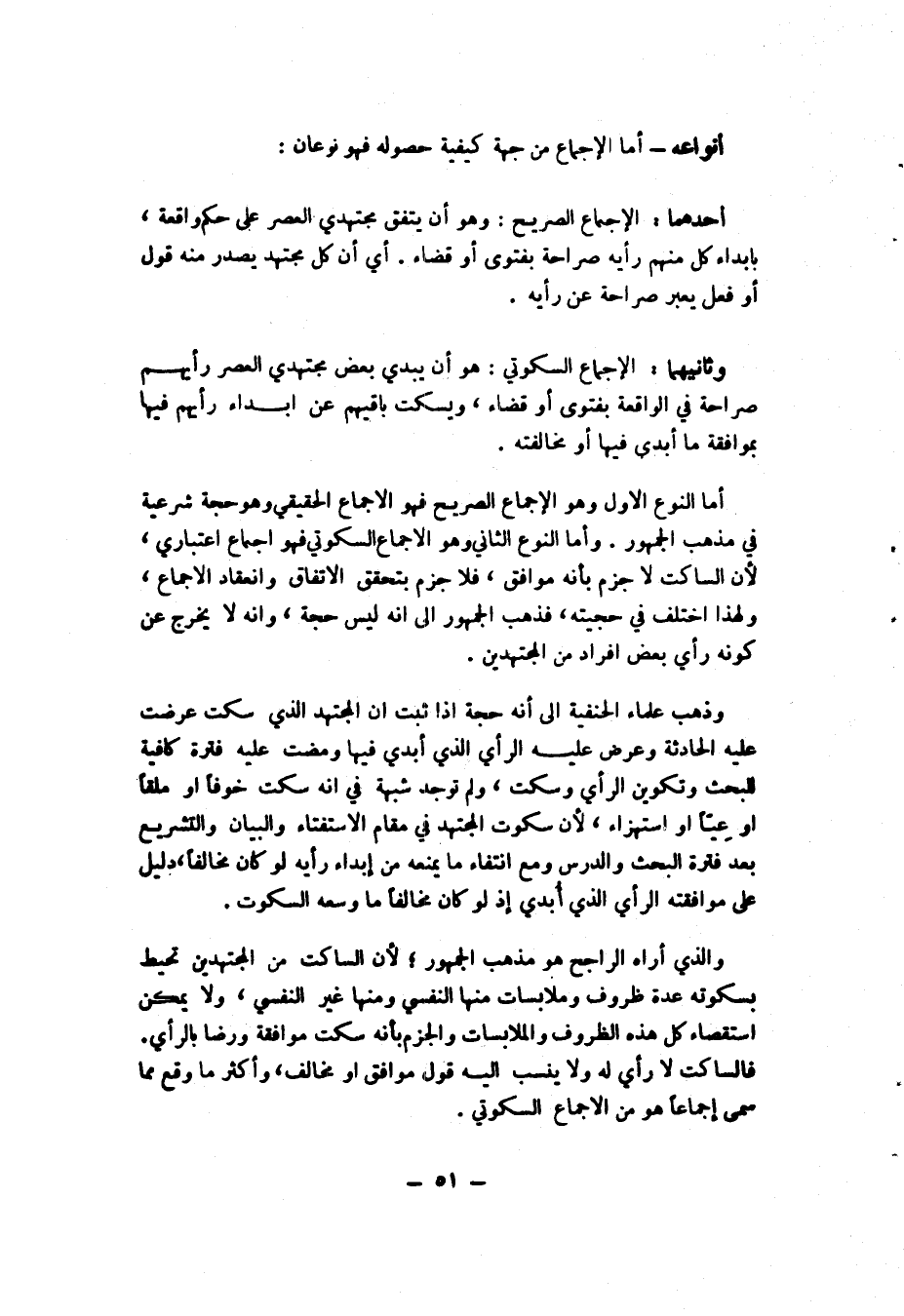 وثانيهما: الإجماع السكوتي: وهو أن يبدي بعض مجتهدي العصر رأيهم صراحة في الواقعة بفتوى أو قضاء، ويسكت باقيهم عن إبداء رأيهم فيها بموافقة ما أبدي فيها أو مخالفته.