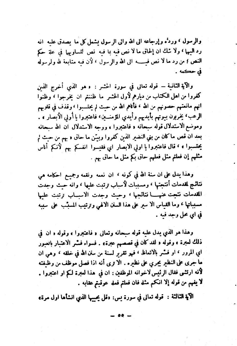 والآية الثانية: قوله تعالى في سورة الحشر: {هُوَ الَّذِي أَخْرَجَ الَّذِينَ كَفَرُوا مِنْ أَهْلِ الْكِتَابِ مِن دِيَارِهِمْ لِأَوَّلِ الْحَشْرِ مَا ظَنَنتُمْ أَن يَخْرُجُوا وَظَنُّوا أَنَّهُم مَّانِعَتُهُمْ حُصُونُهُم مِّنَ اللَّهِ فَأَتَاهُمُ اللَّهُ مِنْ حَيْثُ لَمْ يَحْتَسِبُوا وَقَذَفَ فِي قُلُوبِهِمُ الرُّعْبَ يُخْرِبُونَ بُيُوتَهُم بِأَيْدِيهِمْ وَأَيْدِي الْمُؤْمِنِينَ فَاعْتَبِرُوا يَا أُولِي الْأَبْصَارِ} [الحشر: 2] ، وموضع الاستدلال قوله سبحانه {فَاعْتَبِرُوا} ووجه الاستدلال أن الله سبحانه بعد أن قص ما كان من بني النضير الذين كفروا وبين ما حاق بهم {مِنْ حَيْثُ لَمْ يَحْتَسِبُوا} ، قال {فَاعْتَبِرُوا يَا أُولِي الْأَبْصَارِ} أي فقيسوا أنفسكم بهم لأنكم أناس مثلهم إن فعلتم مثل فعلهم حاق بكم مثل ما حاق بهم. وهذا يدل على أن سنة الله في كونه، أن نعمه ونقمه وجميع أحكامه هي نتائج لمقدمات أنتجتها، ومسببات لأسباب ترتبت عليها، وأنه حيث وجدت المقدمات نتجت عنها نتائجها، وحيث وجدت الأسباب ترتبت عليها مسبباتها، وما القياس إلا سير على هذا السنن الإلهي وترتيب المسبب على سببه في أي محل وجد فيه.