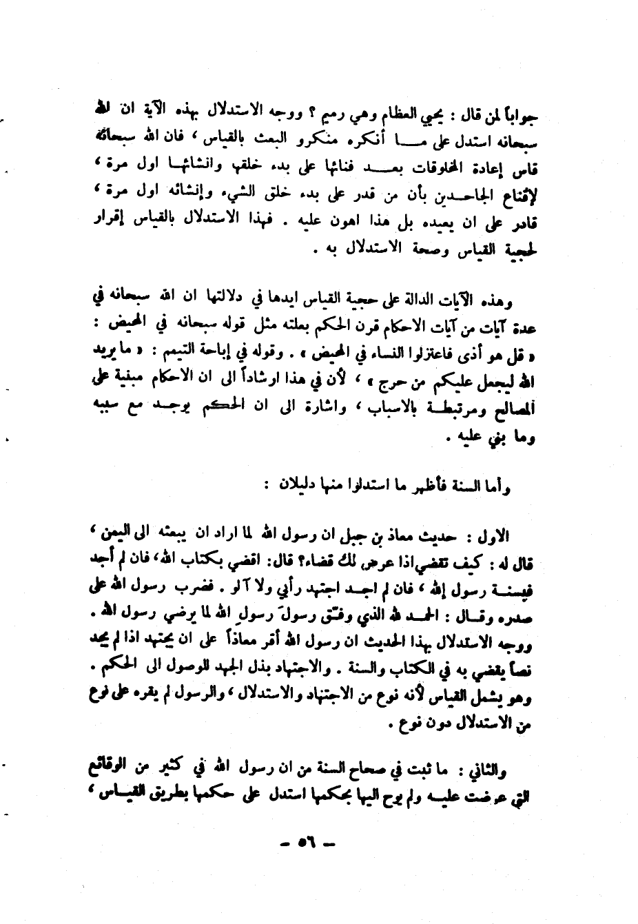 الأول: حديث معاذ بن جبل أن رسول الله لما أراد أن يبعثه إلى اليمن، قال له: "كيف تقضي إذا عرض لك قضاء؟ " قال: أقضي بكتاب الله، فإن لم أجد فبسنة رسول الله، فإن لم أجد اجتهد رأيي ولا آلو، فضرب رسول الله على صدره وقال: "الحمد لله الذي وفق رسول رسول الله لما يرضى رسول الله"، ووجه الاستدلال بهذا الحديث أن رسول الله أقر معاذاً على أن يجتهد إذا لم يجد نصا يقضي به في الكتاب والسنة، والاجتهاد بذلك الجهد للوصول إلى الحكم، وهو يشمل القياس لأنه نوع من الاجتهاد والاستدلال والرسول لم يقره على نوع من الاستدلال دن نوع.