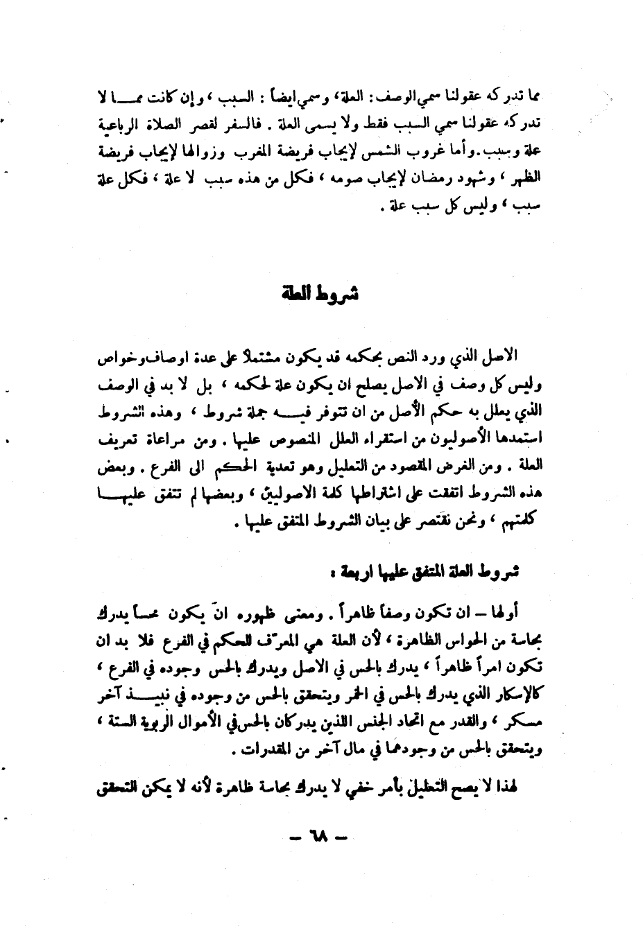 أولها: أن تكون وصفا ظاهرا: ومعنى ظهوره أن يكون محسا يدرك بحاسة من الحواس الظاهرة، لأن العلة هي المعرف للحكم في الفرع فلابد أن تكون أمرا ظاهرا، يدرك بالحس في الخمر، ويتحقق بالحس من وجوده في نبيذ آخر مسكر، والقدر مع اتحاد الجنس اللذين يدركان بالحس في الأموال الربوية الستة، ويتحقق بالحس من وجودهما في مال آخر من المقدرات.
