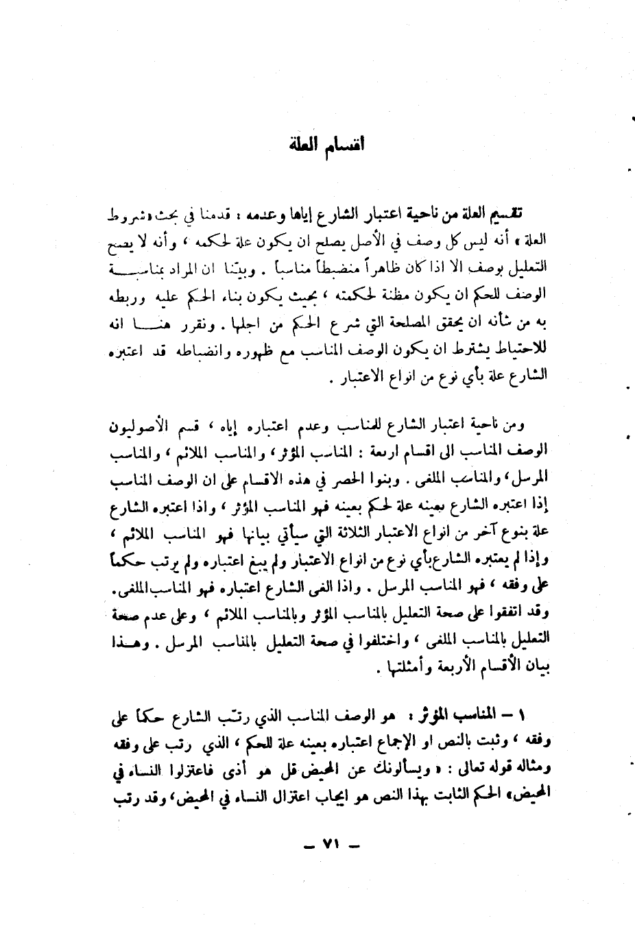 1- المناسب المؤثر: هو الوصف المناسب الذي رتب الشارع حكماً على وفقه، وثبت بالنص أو الإجماع بعينه علة للحكم، الذي رتب على وفقه، ومثاله قوله تعالى: {وَيَسْأَلُونَكَ عَنِ الْمَحِيضِ قُلْ هُوَ أَذًى فَاعْتَزِلُواْ النِّسَاء فِي الْمَحِيضِ} [البقرة: 222] ، الحكم الثابت بهذا النصل هو إيجاب اعتزال النساء في المحيض، وقد رتب على أنه أذى، وصوغ النص صريح في أن علة هذا الحكم هو الأذى، فالأذى لإيجاب اعتزال النساء في المحيض وصف مناسب مؤثر.