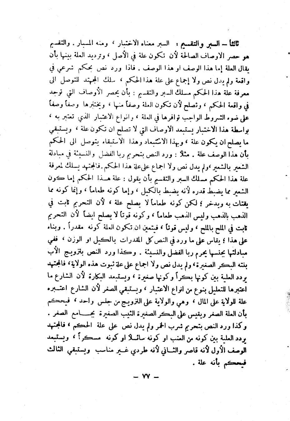 ثالثا: السبر والتقسيم: السبر معناه الاختبار، ومنه المسبار. والتقسيم هو حصر الأوصاف الصالحة لأن تكون علة في الأصل، وترديد العلة بينها بأن يقال العلة إما هذا الوصف أو هذا الوصف. فإذا ورد نص بحكم شرعي في واقعة ولم يدل نص ولا إجماع على علة هذا الحكم، سلك المجتهد للتوصل إلى معرفة علة هذا الحكم مسلك السبر والتقسيم: بأن يصر الأوصاف التي توجد في واقعة الحكم، وتصلح لأن تكون العلة وصفا منها، ويختبرها وصفا وصفاً على ضوء الشروط الواجب توافرها في العلة، وأنواع الاعتبار الذي تعتبر به، بواسطة هذا الاختبار يستبعد الأوصاف التي لا تصلح أن تكون علة، ويستبقي ما يصلح أن يكون علة، وبهذا الاستبعاد وهذا الاستبقاء يتوصل إلى الحكم بأن هذا الوصف علة.